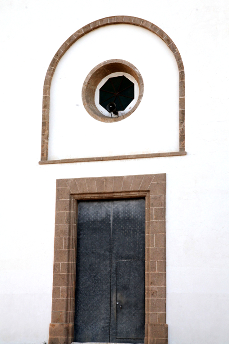 «…Se trata de un edificio exento, construido con obra de mampostería y tejado a dos aguas en las naves y cúpula sobre tambor de teja vidriada en azul. La fachada, orientada a mediodía, tiene forma rectangular con un perfil superior que acusa la distribución interior de nave central más alta y capillas laterales más bajas. Superficie enyesada y esquinas de sillares en escala. Portada de sillares, dovelada. Óculo redondo en el frontón dentro de un espacio delimitado por arco de medio punto, motivo característico de identificación. Espadaña con estribos, tímpano triangular y hueco de medio punto.