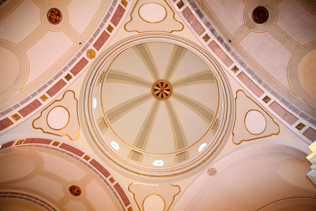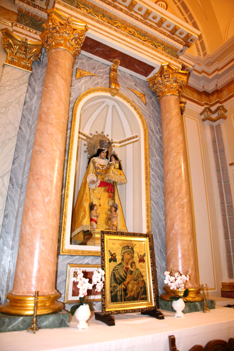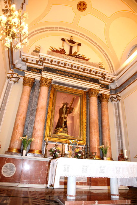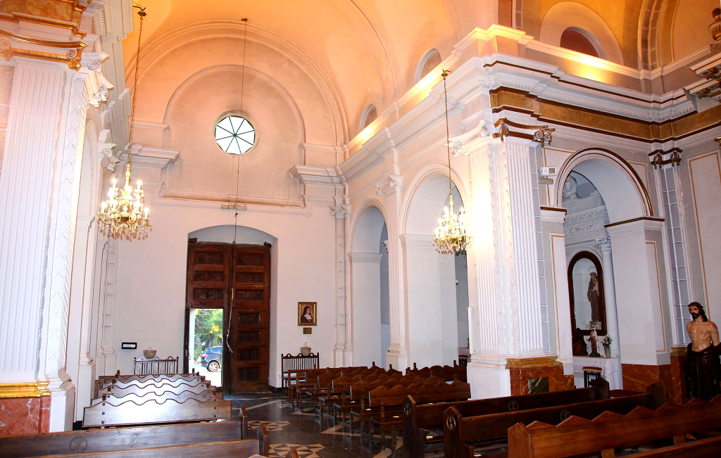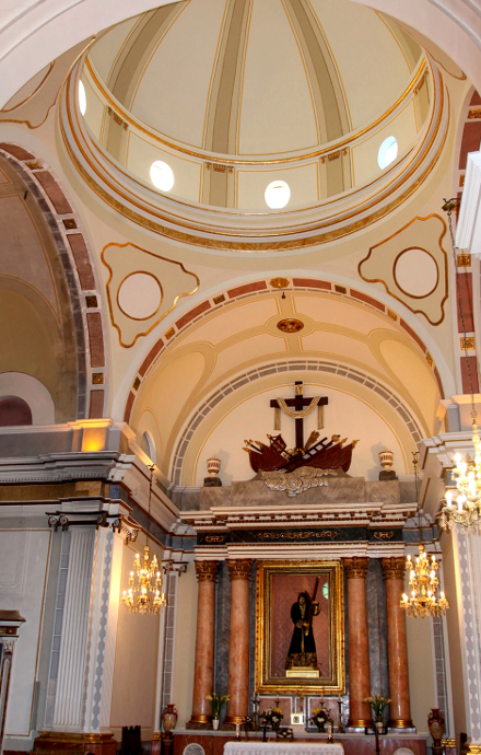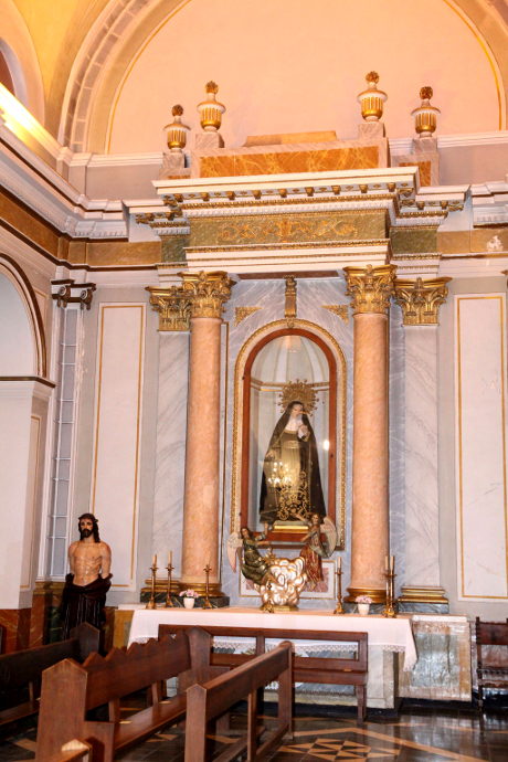 La planta, se ha dicho en cruz griega, pero en realidad es en forma de cruz latina. Tiene nave a los pies, con capillas entre los contrafuertes. Pilastras a la faz con capiteles corintios entablamento y arcos fajones, que soportan la bóveda de cañón. El crucero tiene la anchura de la nave más las capillas y se cubre con cúpula sobre tambor, pechinas y arcos torales. Todo el patrimonio mueble fue destruido en el verano de 1936…». (4)