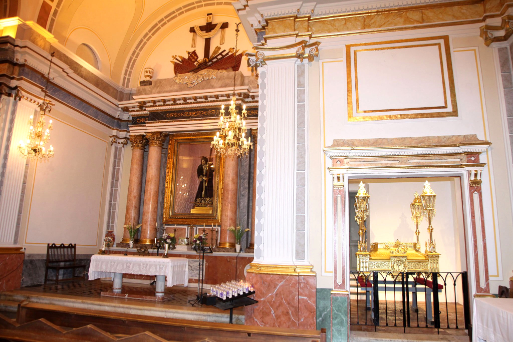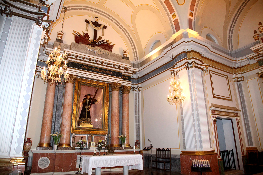 «…Levantada sobre una capilla anterior del año 1770. La Cofradía encargada de la custodia de la imagen y del mantenimiento de la ermita, se planteó la construcción de un nuevo recinto sagrado más amplio y acorde a las necesidades de la devoción y culto. Con este objetivo, en 1848, se nombró a mosén Joseph Español, vicario y beneficiado de la Parroquia, depositario y administrador de los fondos para la construcción de la nueva capilla. En 1849, después de la fiesta del 3 de mayo, se procedió al derribo de la antigua ermita y el día 14 a excavar los cimientos. Fue inaugurada solemnemente -sin el camarín y el atrio proyectado- el día 29 de abril de 1856.