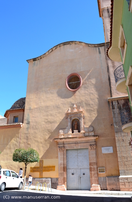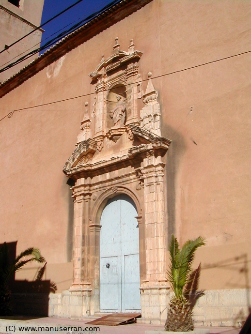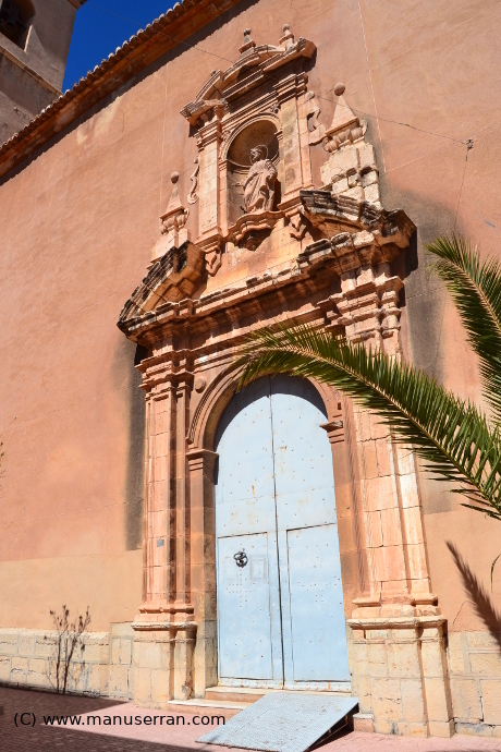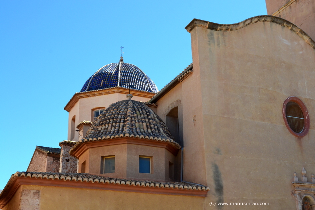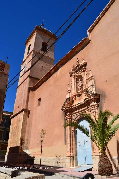 «…El templo actual es del siglo XVIII. Gran edificio exento con dos cúpulas: una que corona la torre, haciendo un extraño efecto, y otra peraltada sobre un gran tambor octogonal, encima del crucero. Destaca la fachada sur, con una portada clásica dedicada a San Pedro, con un frontón partido y una reja de hierro forjado. En el interior es interesante el gran espacio de la nave, de dimensiones considerables (gran altura de cúpula y nave) y gran luminosidad gracias a las ventanas del tambor (las de la nave están cegadas). Consta de nave central de cuatro tramos, con capillas laterales separadas por pilastras poco ornamentadas, crucero y presbiterio de regular profundidad. La cúpula con tambor se dispone sobre pechinas con altorrelieves de los evangelistas. Son característicos los adornos en la bóveda de cañón: ornamentos puntuales, barrocos, a base de motivos vegetales. Es interesante la Capilla de la Comunión, la primera del lado del evangelio, con una curiosa planta en T y cúpula cubierta con tejas sin vitrificar, un zócalo de mármol rojo recorre el recinto y paredes y techos están cubiertos con una abigarrada decoración de relieves dorados y pinturas al fresco con grutescos, guirnaldas y santos que celebran el Triunfo de la Eucaristía…». (4)