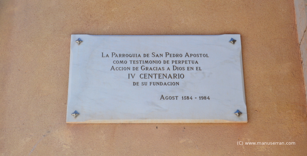«…AGOST: Lugar con ayuntamiento de la provincia Alicante…, situado á los alrededores de un antiguo y fuerte castillo, parte en llano y parte en la pendiente del cerro que aquel ocupa, disfruta de buena ventilación y clima saludable, aunque algo propenso á calenturas catarrales por efecto de la atmósfera. Tiene 400 casas, varias calles, una plaza mayor, en el centro de la cual hay una fuente cuyas aguas se conducen por una cañería, y aunque no son muy buenas, no dañan; otras dos plazas mas chiquitas que la anterior; una escuela de instrucción primaria elemental y otra de niñas, ambas dotadas por los fondos de arbitrios con 1,700 reales anuales aquella, y 1,200 esta; a la primera concurren 50 alumnos, y 70 discipulas á la segunda; una iglesia parroquial bajo la advocación de San Pedro apóstol, servida por un vicario 1º clasificado como curato de primer ascenso y otro 2º, ambos de provisión real ó del ordinario, según el mes de la vacante; una ermita en la cumbre del castillo dedicada al patrón del pueblo, otra cuya titular es Santa Ana y sirve de escuela para las niñas, y otra dedicada á San Ramón propia de D. Andrés Visedo; el cementerio ocupa un punto bien ventilado fuera de la población…». (2)