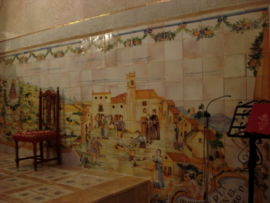 Una puerta a cada lado, dan acceso a la sacristía. El camarín conserva el piso original formado por azulejos decorados con flores y separados por bandas rojas, pero lo más característico de todo es el zócalo del camarín y de la sacristía con azulejos que relatan los portentos de la huida de la Virgen de Alicante, su posterior hallazgo y numerosos hechos milagrosos acaecidos por su mediación, por lo que es tan venerada; estos paneles cerámicos han sido estudiados por Segura Martí, situándolos en los siglos XVIII y XIX.