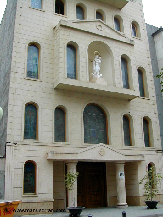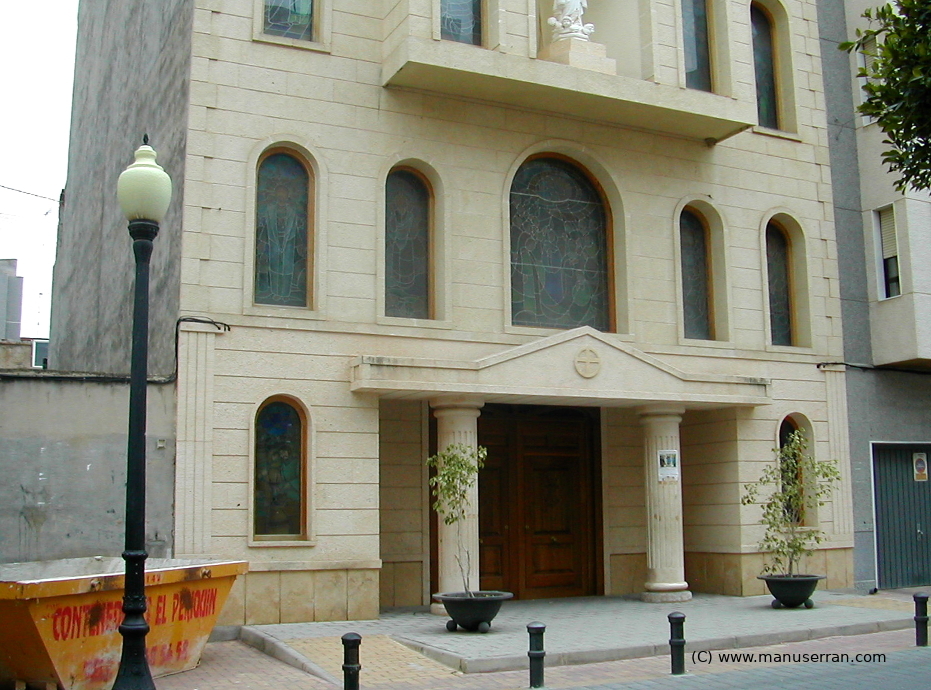 La ermita actual, realizada en 1997, es un edificio entre medianeras, cuya planta baja aloja el templo. La fachada presenta pequeño pórtico con tímpano sobre columnas, hornacina para la imagen de la titular y una serie de ventanas con vistosas vidrieras alusivas a los misterios de la Virgen. La planta de nave única mide 9,85 por 9,78 metros. Tiene coro a los pies y un retablo semicircular, a la cabecera, en mármol rosa y otro, a la derecha, con la Virgen del Rosario. Techo chapado de madera…». (2)