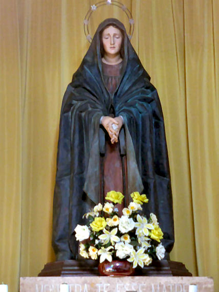 En la cabecera un amplio nicho con bóveda de horno. Preside la iglesia la imagen de la Virgen del Calvario, realizada en 1952, y es debida a la gubia de Vicente Rodilla Zanón, imaginero valenciano; mide 1,40 m. y está realizada en pino de Suecia. En la sacristía se situó una dramática imagen Santísimo Cristo de la Sed, debida a un discípulo de Rodilla Zanán, llamado Francisco Navarro Soriano…». (1)