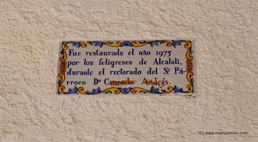 Sobre la fachada principal se observan dos retablos cerámicos con la siguiente leyenda, “Ermita de San Juan Bautista de Mosquera, patrón de Alcahali” y “Fue restaurada el año 1975 por los feligreses de Alcalalí, durante el rectorado del Sr. Párroco Dn. Conrado Andrés”.