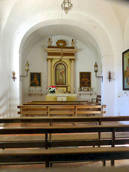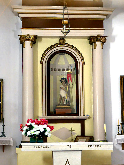 La planta del templo es de una sola nave rectangular, mide 10,38 por 6,86 metros. Tiene dos arcos diafragmas de medio punto rebajado, apoyados sobre impostas y cubre con bóveda de cañón que forma lunetos con los muros. En el testero recto tiene retablo de estilo neoclásico que, entre columnas y entablamento, encierra una hornacina con imagen de San Juan Bautista Niño. A los lados cuadros del Sagrado Corazón de Jesús y Sagrado Corazón de María y, antiguamente, se acompañaba hasta por cincuenta y siete ex-votos en acción de gracias por las obtenidas. La imagen de San Juan que actualmente se venera en la ermita fue tallada en Valencia por Luís Gilabert Ponce a últimos del siglo XIX durante el rectorado del párroco Planelles…». (4)