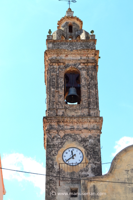 En cuanto a la torre campanario se compone de tres partes, la parte más baja está cubierta de revestimiento continuo sin pintar, en la segunda parte se ubica el reloj, que por su colocación se deduce posterior a la construcción de la misma. Además una pequeña reja denota que anteriormente posiblemente hubiera un balcón. Su parte más alta es donde se ubican las campanas. Su decoración en relieve es sencilla, molduras horizontales y cuatro pilastras en cada cara de la torre marcan la zona del campanario. La cornisa se remata con cuatro pequeños pináculos, y una pequeña construcción marcada con apoyos curvados, levantan la veleta metálica que corona las alturas de la torre.