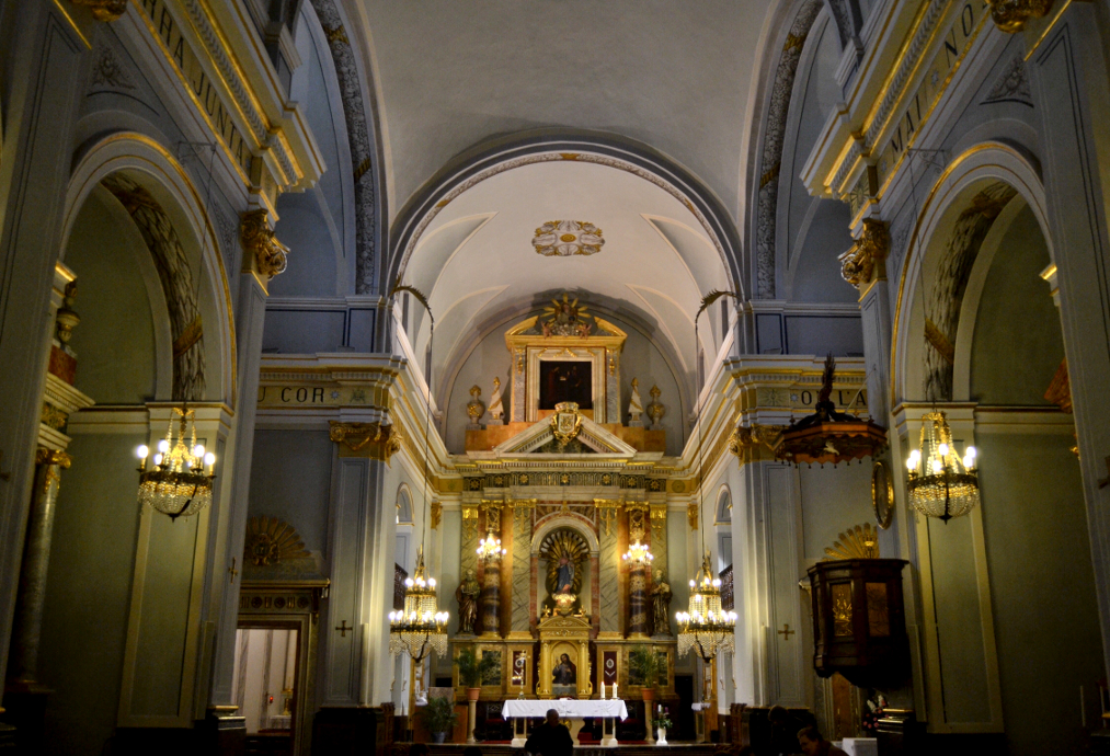 Interiormente la iglesia dispone de una única nave abovedada, con altares a ambos lados de la misma de menor altura que la nave. En la zona más próxima al altar la planta se ensancha, ubicando en sus laterales los altares del Santísimo Cristo de la Salud y de Santa Teresa de Jesús, mientras que el altar mayor está dedicado a la Natividad de Nuestra Señora. En la parte derecha de la nave, próximo al altar de Santa Teresa de Jesús se ubica un pequeño púlpito. Los altares más próximo al acceso están dedicados a San Miguel Arcángel y San Juan Bautista (altares de la izquierda), y San Joaquín y San Antonio Abad (altares de la derecha).