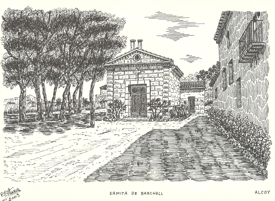 Sanchis y Sivera hace referencia al lugar, aunque omite cualquier mención a la ermita: «…Barchell, Barxell, Barquten o Barcheta, con todos estos nombres vemos denominada una alquería situada en un llano cerca de Alcoy, donde se ve todavía un castillejo arruinado, de la que se dieron casas, en Iº, de agosto de 1249, al escudero Fortún Pérez de Salces. En 7 de diciembre de 1338, adquirieron durante su vida el nuevo imperio y jurisdicción de este poblado el conde de Terranova y Margarita de Lauria. En 3 de agosto de 1467, el Justicia, Jurados, Consejo, Universidad y particulares de Alcoy, compraron al rey Jaime II, con escritura ante Juan de Coloma, las alquerías de Barchell y Xirillent. El manantial de Barchell que allí existe movía, como hoy, en tiempo de los moros, muchas fábricas de tejidos…» (2)