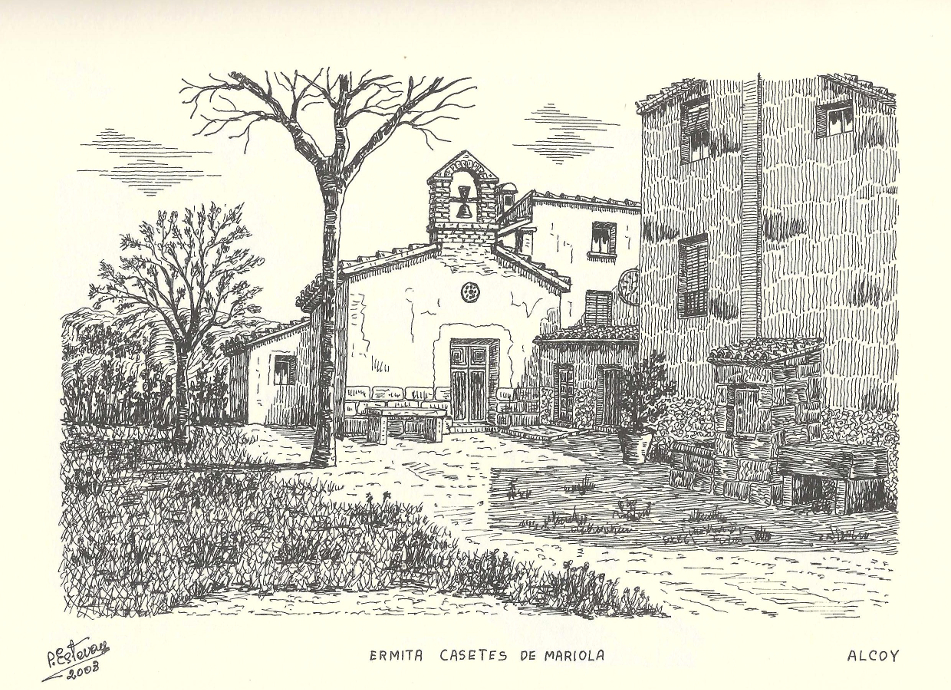La ermita de Casetes de Mariola, de propiedad particular y hoy cerrada, es pequeña y muy antigua. Aquí se prestaba el servicio religioso a la partida. El familiar nombre de Casetes de Mariola evoca el pasado rural alcoyano. Hace unos ochenta años la vid era la plantación mas extendida en la zona, al año se producían unos cinco mil cántaros de vino. Desgraciadamente hubo de ser arrancada debido a una epidemia de filoxera. Esto daría paso al cultivo del cereal, girasol, frutales y olivos…». (1)