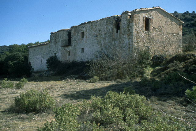 El conjunto, originario del siglo XIX y construido en mampostería, se encuentra prácticamente en ruinas. Consta de un edificio principal, adosadas a éste, varias edificaciones secundarias y una gran tapia que hace de cierre dejando en su interior el patio. Sobresale al exterior de la masía, en el lado contrario al edificio principal, la ermita. De planta rectangular, aún se observan restos de la decoración original en sus paredes y altar…». (3)