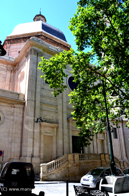 El exterior es clásico, con abundancia de pilastras con capiteles corintios, balaustradas, nichos, ventanas circulares con vidrieras de colores, etc. Por su impacto urbano son importantes la gran cúpula de pizarra gris y el esbelto campanario octogonal: este último cierra la perspectiva de la calle Sant Francesc y ambos conforman el perfil del centro histórico. El interior, clásico y sin ornamentos, consta de una nave de gran anchura de dos tramos, con curiosos arcos elípticos, coro alto a los pies y brazos y presbiterio poco profundos. Las capillas laterales, de pequeñas dimensiones, tienen escasa presencia. El crucero está cubierto con linterna que domina el espacio interior. En el deambulatorio del tambor, de gran altura, se disponen estatuas de bulto y ventanales cuadrados con vidrios blancos. Destacan la espacialidad y luminosidad del interior…». (2)