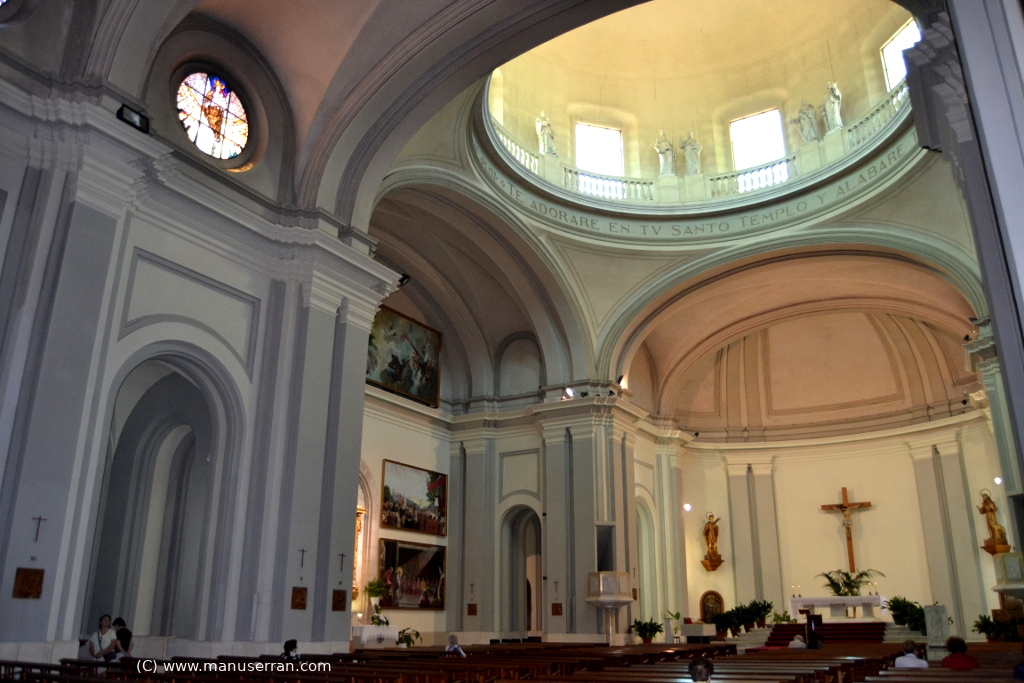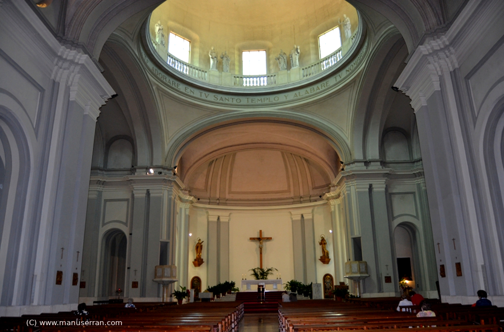 Consta de una sola nave de elevada bóveda. En ella hay dos capillas: la de S. Luis Obispo y la del Niño Jesus del Huerto que es la mayor y fue erijida en 1776. Al lado izquierdo del altar mayor está la capilla de la Comunion, de mucha capacidad; y al otro lado la espaciosa sacristía con entrada al archivo y biblioteca. El altar mayor de este santuario, obra de Fr. Cabezas, es lo mas notable que posee: su primer cuerpo es del órden compuesto, y coríntio el segundo.