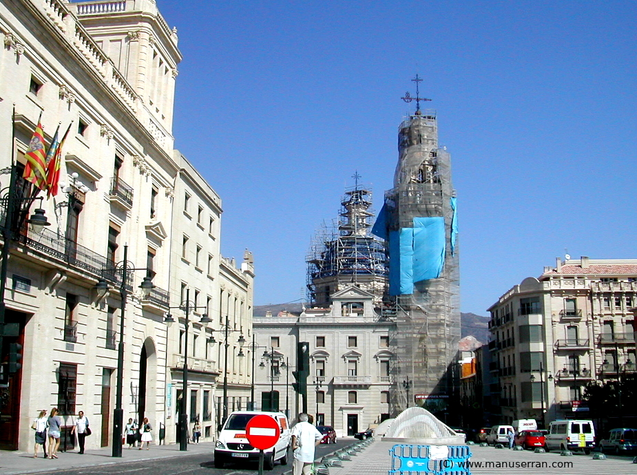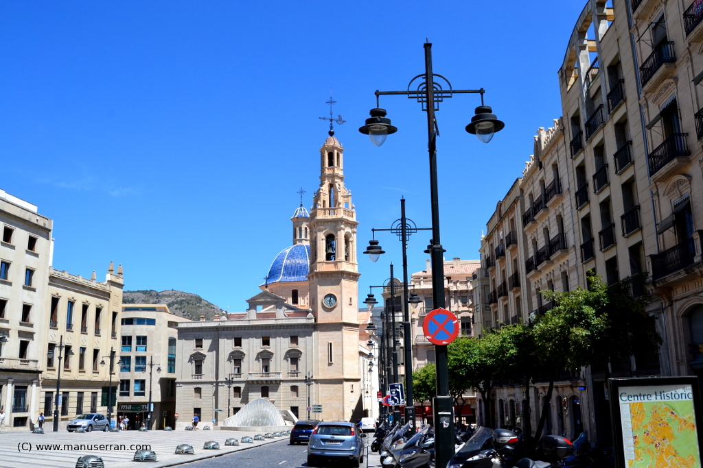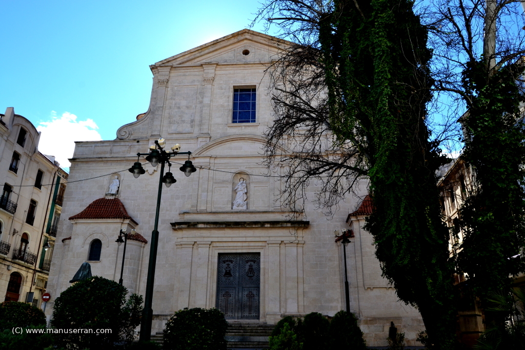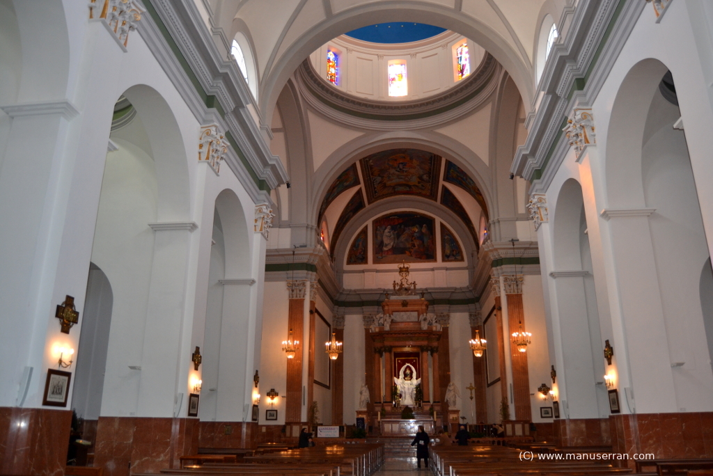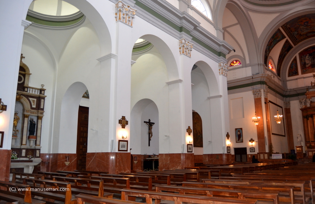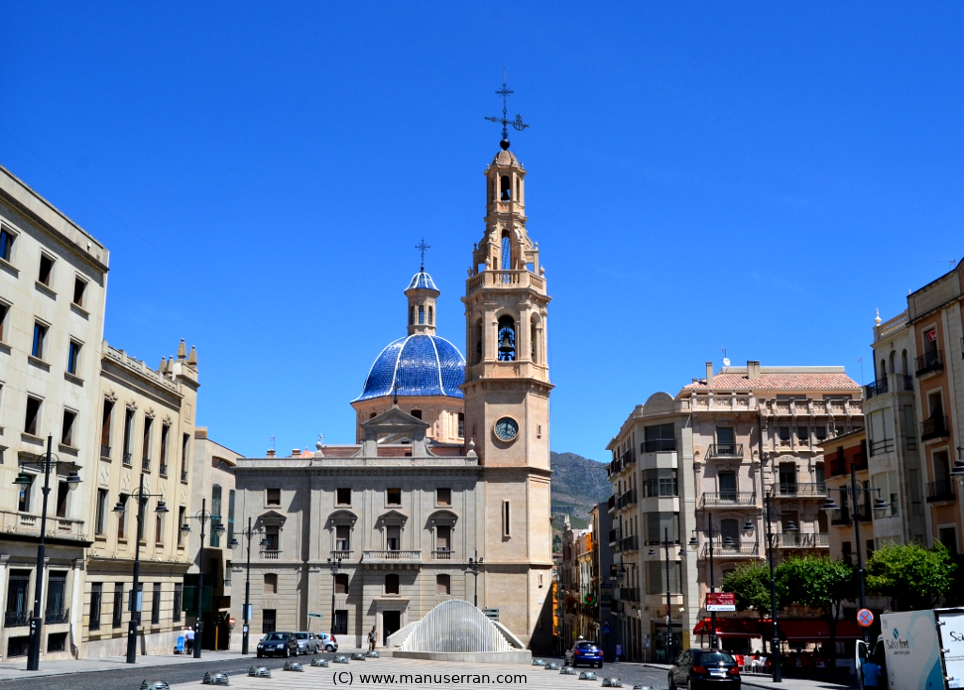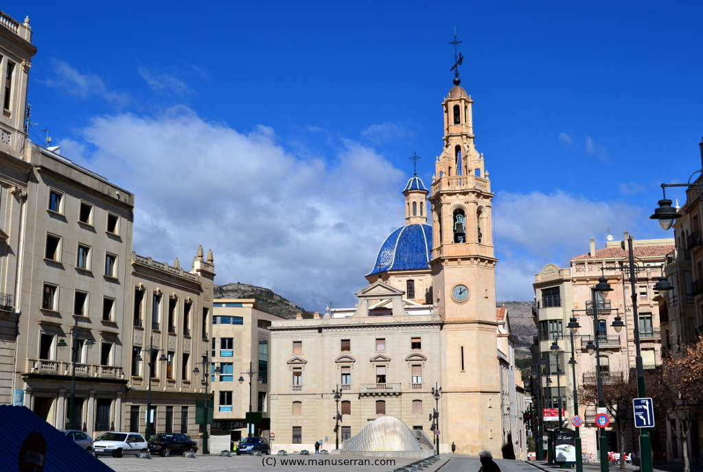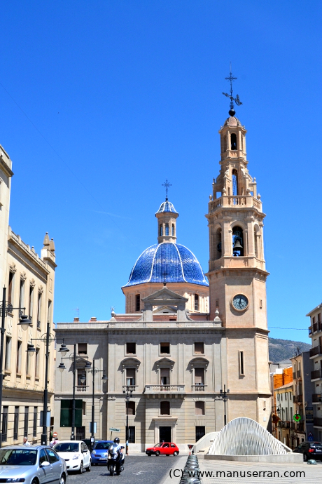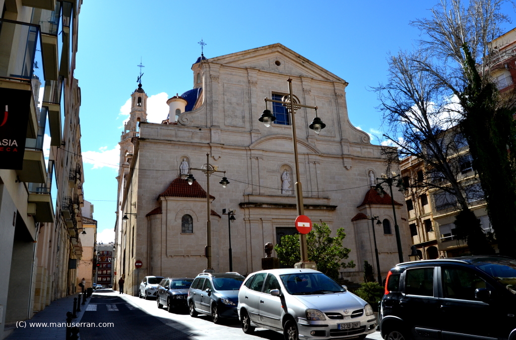 El edificio tiene dos portadas: una, situada a los pies del templo, mira a la ciudad antigua; en la otra hay oficinas parroquiales y recae a la plaza de España. Esta última es la más conocida, ya que sirve de fondo a los principales actos de las fiestas de moros y cristianos; es una fachada clásica, de apariencia más civil que religiosa, en consonancia con el uso de oficinas. Junto a ella se levanta el esbelto campanario y, más atrás, la cúpula de teja azul con tambor alto y elevada linterna, característicos del perfil urbano de Alcoy. La gran fachada de los pies, viñolesca, está rematada por un frontón y tiene a los lados dos cuerpos que sobresalen. La composición evoca la fachada barroca (1725-1768) del templo destruido en 1936. El interior es clásico, desnudo, sin ornamentación. Tiene planta de cruz latina, nave de tres tramos cubierta con bóveda de cañón sobre falsos lunetos (quizás construida de hormigón), capillas laterales cubiertas con cúpulas, coro a los pies y crucero. El presbiterio, presidido por un gran tabernáculo, es la única parte de la iglesia decorada con pinturas, dorados y frescos. Se trata de una arquitectura religiosa de posguerra que presenta ciertas diferencias a la oficial de obispado construida por A. Serrano Peral, ya que aquí se hace un ejercicio académico que recuerda iglesias del siglo XIX…». (1)