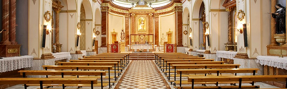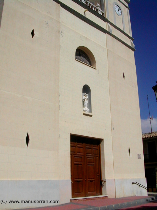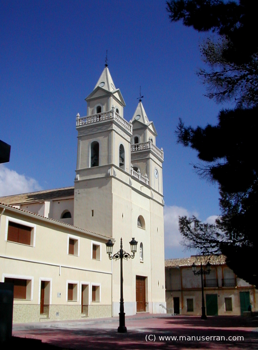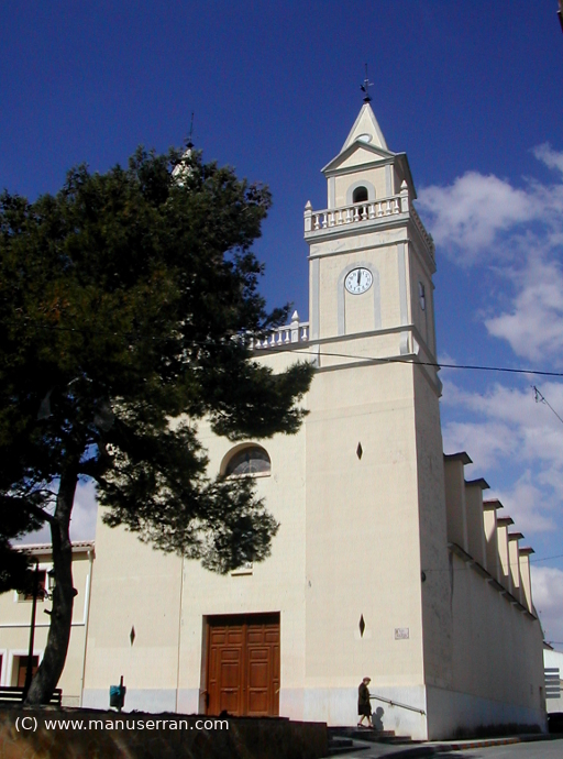 «…El templo, dedicado a San José, se encuentra situado en la Plaza de la Iglesia, esquina a la calle Antonio Machado. Su origen data del año 1828, cuando D. Felipe Herrero Valverde, Obispo de Orihuela, decretó la creación de una vicaría rural en esta localidad, dependiendo de la parroquia de Monóvar. Construida sobre el solar en el que, hasta entonces, venía existiendo una ermita, es de estilo románico. Tiene una gran nave central y una capilla en uno de sus laterales. Se trata de una iglesia caracterizada principalmente por sus dos torres gemelas, cuadradas, una de las cuales alberga un reloj y la otra tres campanas. Si bien es cierto, originariamente sólo disponía de una torre (al levante) que fue construida al mismo tiempo que la Iglesia. En 1930 fue construida la torre de poniente, bajo la dirección del cura párroco D. José García, que tenía notorias cualidades artísticas, con el mismo estilo que la de levante, construyendo además, la terraza que une ambas torres…». (4)