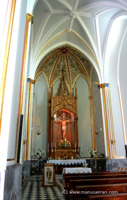 Tiene planta en forma de cruz latina, pilastras con columnillas en las esquinas y capiteles bizantinos en los que nacen los arcos perpianos de medio punto que sostienen la bóveda de cañón. Crucero con ábside hexagonal donde las pilastras se sustituyen por columnas y arcos apuntados que sostienen una bóveda de horno. En el centro del presbiterio se alza un templete de madera que alberga la imagen del Santo Cristo a quien está dedicada la ermita; es una imagen de muy buenas proporciones y elegante talla debida a la gubia del imaginero José Mª. Ponsoda…». (4)