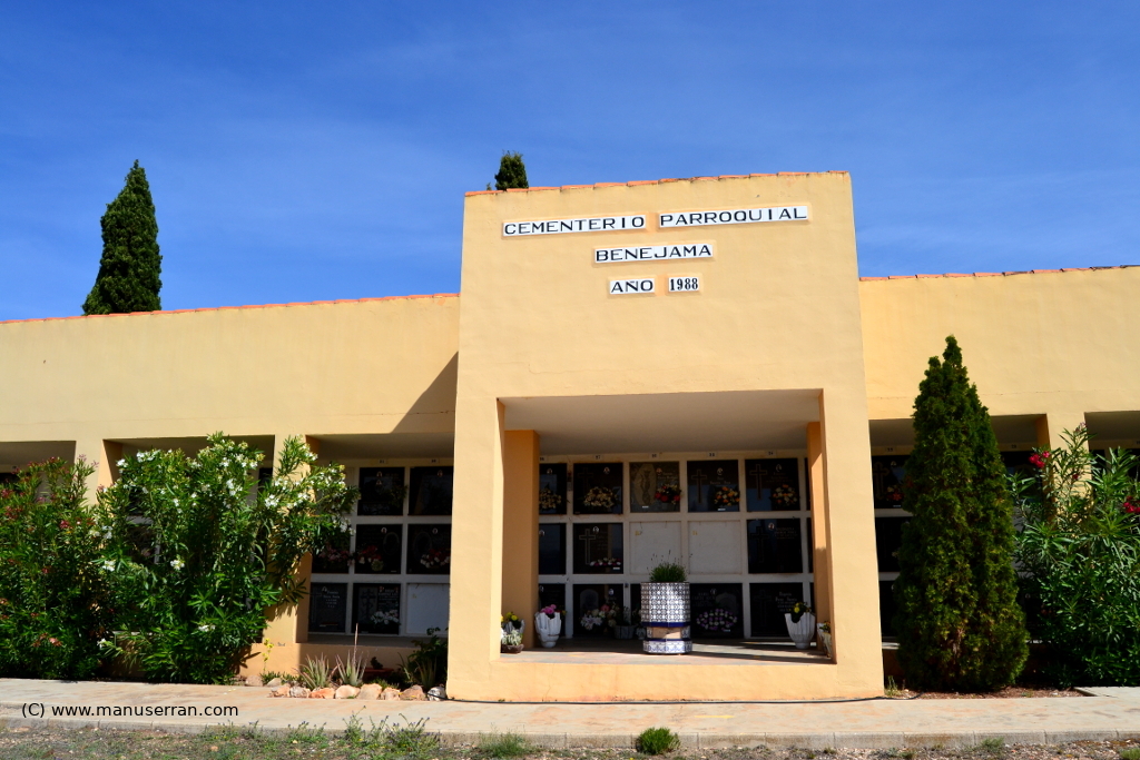 «…Ermita incluida dentro del recinto del cementerio, junto a la carretera de Fontanares, a un kilómetro aproximadamente de Benejama. Hay constancia de que fue construida en el año 1867, por lo que es anterior al cementerio, cuya construcción data de 1880-1882. En ella finalizaba un Vía-crucis que partía de la población. La última ampliación corresponde a 1988.