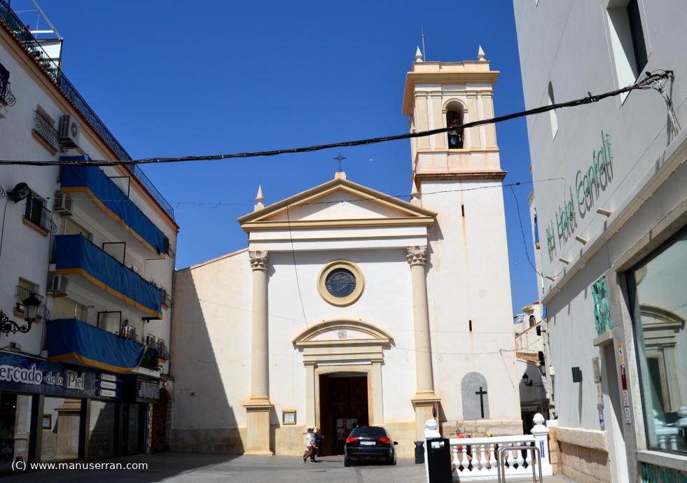 «…Se sitúa la iglesia en la parte superior del pueblo antiguo, en lo alto del cerro Canfali. Prácticamente exenta, articula tres plazas, dos de ellas recayentes al mar y que actúan como mirador. En la tercera, la plaza de Sant Jaume, más urbana, es donde se encuentra el acceso principal. Tiene planta de cruz latina con nave central y pequeñas capillas laterales. La cúpula de media naranja, sin tambor, apoya directamente sobre pechinas pintadas con frescos. En el lado del evangelio está la capilla de la Virgen del Sufragio. Exteriormente está pintada de blanco, aunque las cornisas y molduras ofrecen un contrapunto ocre de un repintado reciente. En la plaza de Castelar destaca la potencia de las dos cúpulas, la del crucero y la de la capilla cubiertas con teja vidriada azul, que rematan sendas plantas octogonales…». (4)