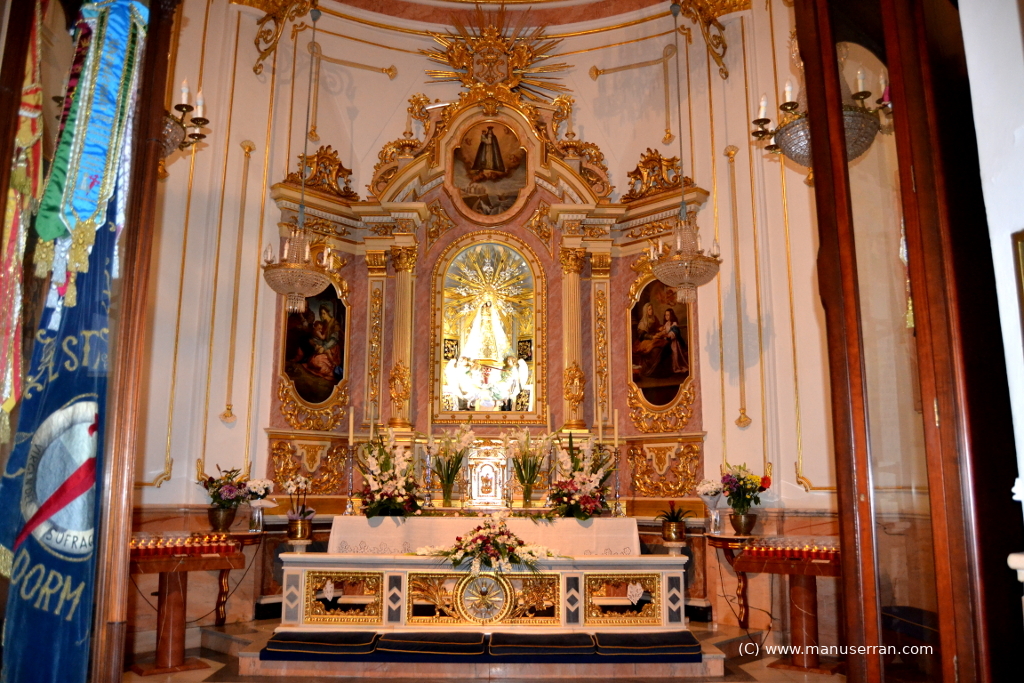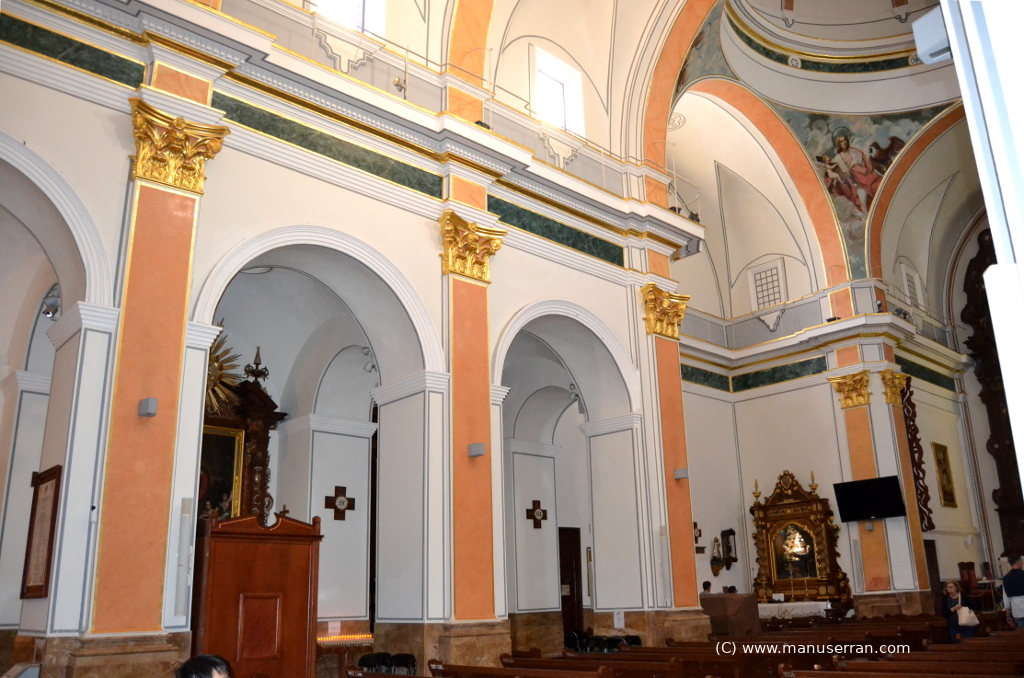 La fachada del templo es sencilla. A su entrada á mano izquierda se encuentra la capilla circular de la Virgen del Sufragio. A la derecha se halla situada la pila bautismal en forma de concha, elegantemente labrada de mármol negro con cintas blancas, procedente de la mina de Callosa de Ensarriá, de las mejores que conocemos aunque esté poco explotada ante la dificultad de las comunicaciones, regalo de los condes de Montealegre en 1808 cuando tuvieron que bautizar á su hija doña María de los Desamparados Berniuy y Valda, y cuyo coste excedió de quinientas pesetas.