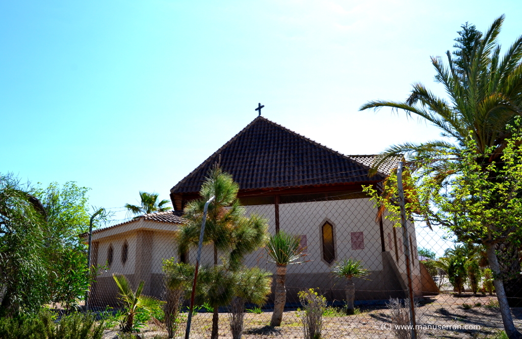 Es un edificio aislado situado en una amplia parcela. Realizado con estructura de hierro, bloques de cemento y ladrillo, parte de un desarrollo del tetraedro con diversas alturas de la techumbre, creando un juego de planos triangulares. Precedida de un porche rectangular con un tejadillo a dos vertientes sobre pilares de hierro. La fachada consta de dos partes la inferior rectangular que contiene la puerta y la superior en forma triangular, formada por una estructura de hierro y cristal que recuerda las casas suizas. La planta es cuadrada que con la amputación de dos de sus ángulos se convierte en hexagonal; uno de dichos lados pequeños es la entrada y el otro, el opuesto, el testero. Delante de éste, dos escalones elevan el piso formando el presbiterio con el altar exento; en el muro testero una hornacina con la imagen de Nuestra Señora del Rosario. Sagrario a un lado y acceso a la sacristía al otro. La cubierta del presbiterio más elevada que el resto, crea una claraboya que arroja gran luz sobre la zona sagrada…». (1)