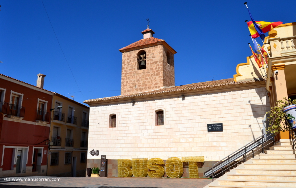 «…BUSOT: Universidad o lugar con ayuntamiento de la provincia de Alicante…, situado al pie de un cerro en las faldas meridionales del monte Cabesó, libre al embate de los vientos del Este, con clima templado y saludable. Tiene mas de 300 casas de antigua fábrica, la del ayuntamiento, pósito para granos, carnicería, matadero, taberna, una escuela de primeras letras, a la que concurren 45 niños, dotada con 1,500 reales, otra de niñas con 50 de asistencia y 360 reales de dotación, una iglesia parroquial (San Lorenzo), servida por un cura de provisión real ó del ordinario, según el mes de la vacante, en rigoroso concurso, un sacristán, organista, manchador y dos monacillos que nombra el diocesano, de cuya parroquia depende la vicaria del lugar de Aguas, una ermita, cementerio y tres fuentes públicas, dos de las cuales son de agua fresca, para surtido del vecindario, y la otra situada á la entrada del pueblo es de una temperatura bastante caliente, y en su abundancia forma un arroyo para regar la huerta, desaguando luego en el mar á dos leguas de su nacimiento…». (3)