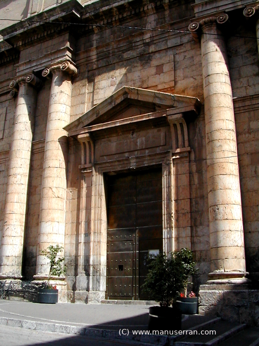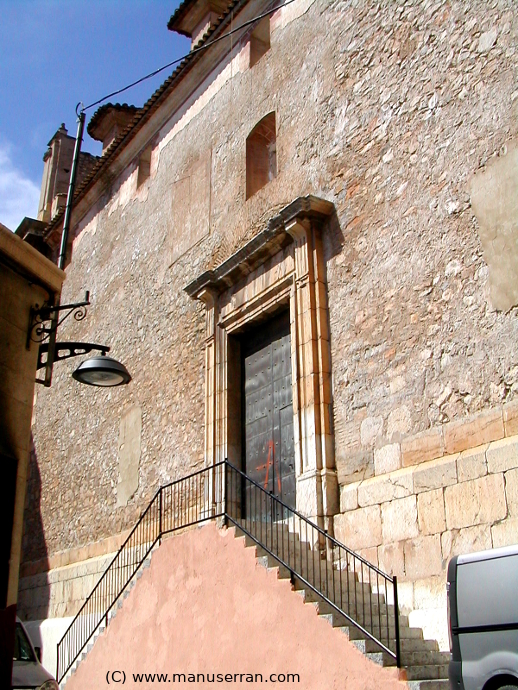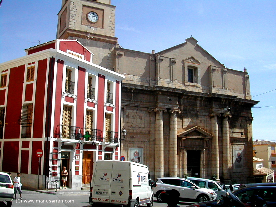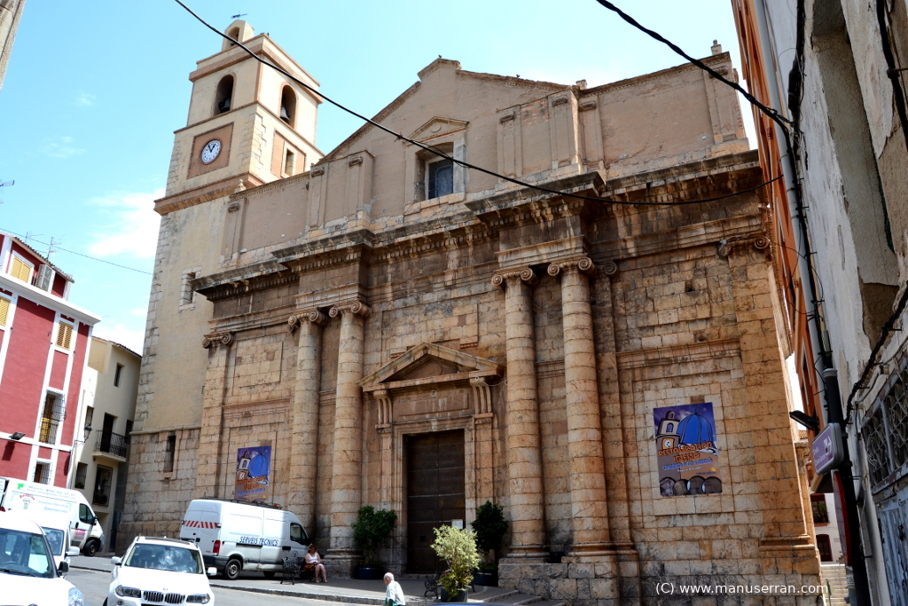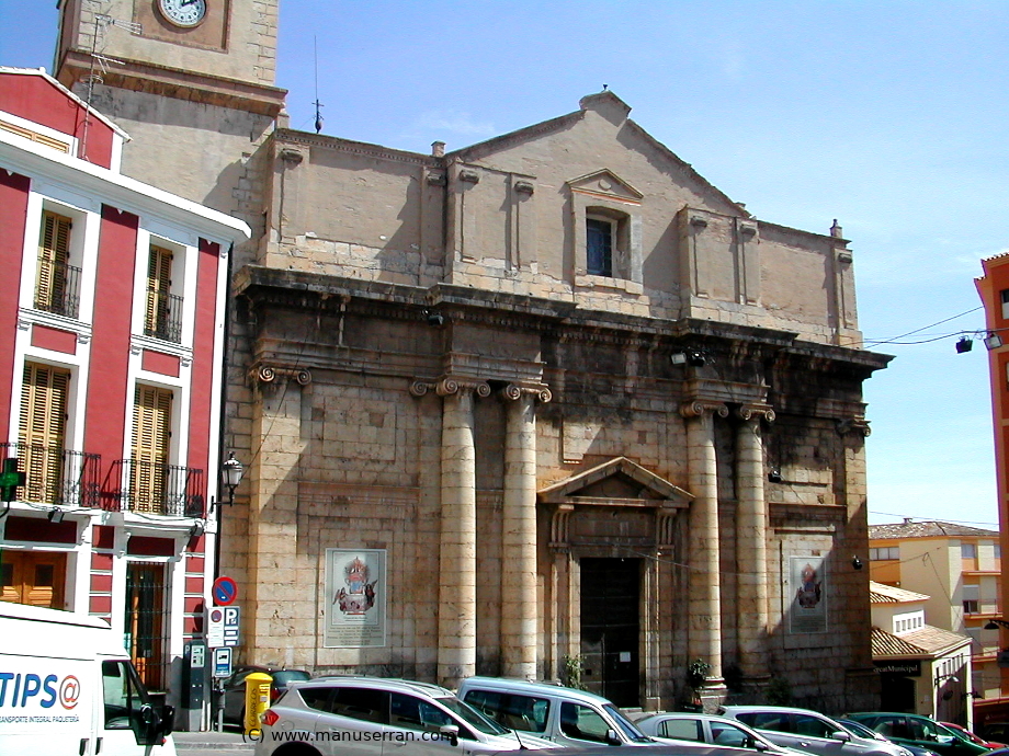 «…Iniciada la construcción de esta iglesia en 1386, se prolongó e interrumpió a lo largo de diferentes periodos, no siendo hasta 1578 la fecha de su inauguración. Templo de planta cruciforme inscrita en un rectángulo, cuatro tramos de capillas laterales comunicadas cubiertas con cúpulas, y otra mayor sobre el crucero. La decoración empleada, es de lunetos semicirculares con guirnaldas en la bóveda de cañón y hojas de acanto en las pechinas. En el exterior, cuatro pilastras jónicas sostienen un entablamento bajo el que se sitúa el acceso. Éste recae a la misma plaza que el ayuntamiento, muy reformado, con tipología de lonja tardomedieval…». (4)