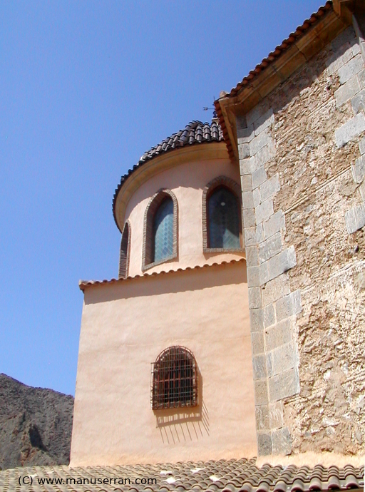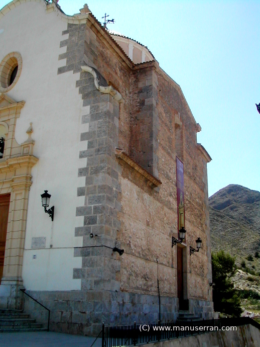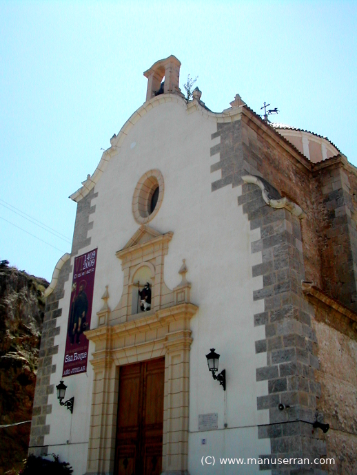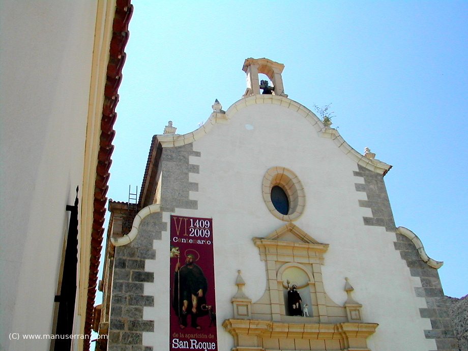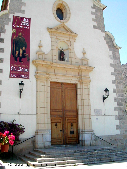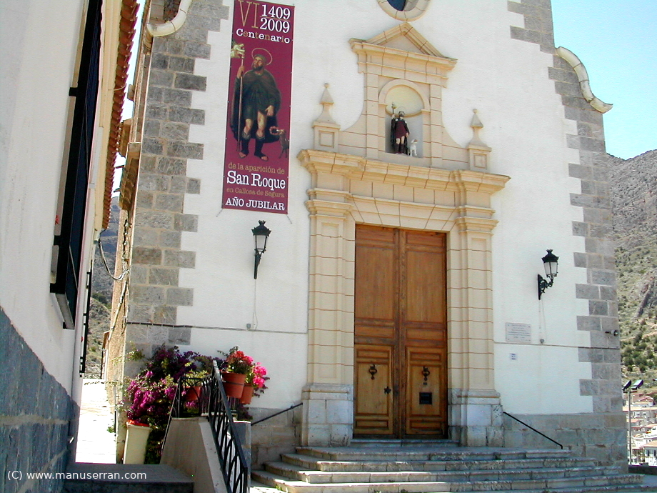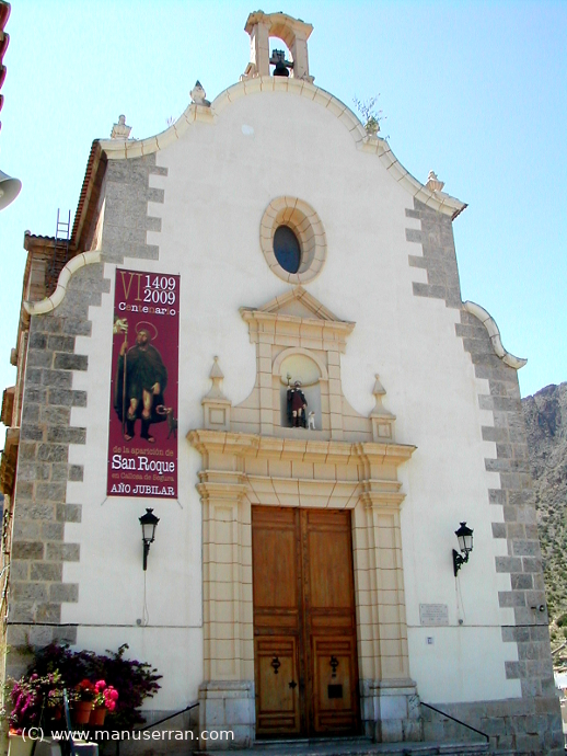 «…La fecha más antigua sobre la construcción de la ermita se refiere al año 1409. Según el relato de Montesinos (2), “…en la noche del 16 de noviembre del año 1409, cuatro pastores estaban guardando un rebaño de ovejas en la montaña cuando advirtieron que en la puerta del corral se apreciaba pintada con vivos colores una imagen de San Roque. Viendo esta aparición decidieron bajar al pueblo y dar cuenta a las autoridades, las cuales mandaron bajar la citada puerta a la parroquia. Así lo hicieron, maravillándose todos de aquel portento, pero, al día siguiente la puerta volvió a encontrarse en el aprisco, en la montaña. Por tres veces volvió a repetirse el hecho, por lo que el prelado de Cartagena don Hernando Pedrosa Ontiveros, mandó que se hiciese, allí mismo, una ermita y así se hizo con las limosnas que ofrecieron los fieles…”. Esta iglesia duró hasta el año 1600 en el que, al parecer, se empezó a levantar una segunda ermita cuyas cuentas aparecen por primera vez en la Visita de 1612, repitiéndose en casi todas las siguientes; figurando, incluso, los gastos de las fiestas y el salario del ermitaño. Esta segunda ermita duró hasta 1761, en que la Visita del Dr. Seva y Cortés, sede vacante, la encontró tan destruida que no se podía celebrar en ella, encargando a la villa la construcción de otro edificio. La ermita nueva, atribuida al arquitecto Miguel Francia Guillén, se concluyó el 6 de febrero de 1796 y se bendijo el 29 de octubre de 1798; es la que ha llegado a nuestros días, siendo objeto de varias restauraciones, la última en 1998, con motivo de su bicentenario.