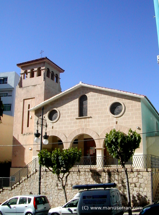 Edificio exento, comprende la nave y dependencias. La fachada pentagonal, orientada al Este; en la parte inferior tiene atrio con tres huecos en arco de medio punto; en la parte superior dos óculos redondos y una ventana alargada que dan luz al coro. Campanario adosado a la izquierda, de planta cuadrada, retranqueado, con aspillera en la parte central y tramo de campanas que repite los tres huecos en arco de medio punto, se techa a cuatro aguas. La campana fue rescatada por un marinero entre los restos olvidados de un naufragio delante de la costa de Almería. Estucado imitando sillares y zócalo de 1,70 metros aplacado de piedra artificial.