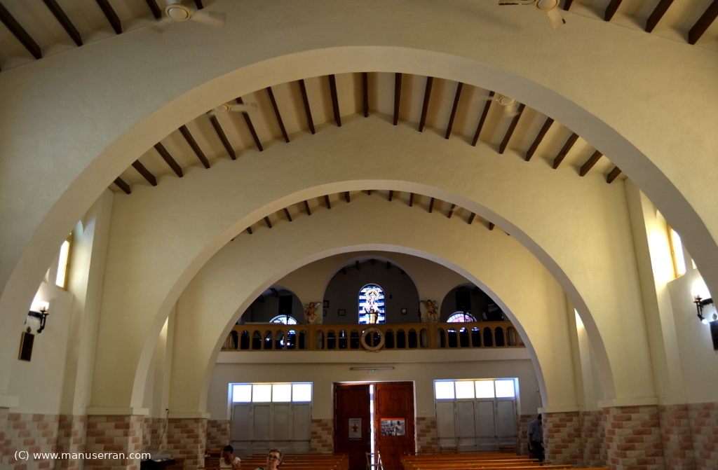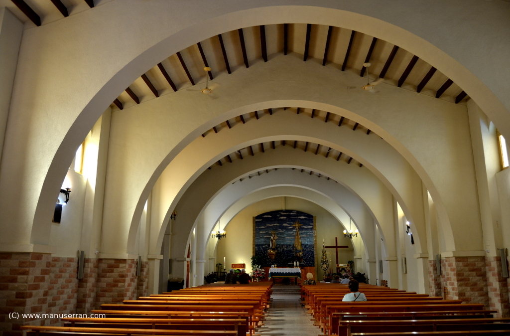 Planta de nave única, rectangular, mide 23,18 por 9,15 metros; tiene seis arcos diafragmas apoyados en pilastras; techo con vigas a lo largo de la nave, a caja con los arcos diafragmas. A los pies tiene coro con balaustrada y muro diafragma con tres arcos de medio punto; los tramos siguientes ostentan tríos de ventanas en situación alta. El sexto tramo es el presbiterio, elevado dos escalones; arco y testero recto con un panel rectangular, sobre una ménsula en forma de quilla, la imagen de Nuestra Señora del Carmen. El templo recuerda los de tipología tardomedieval…». (1)