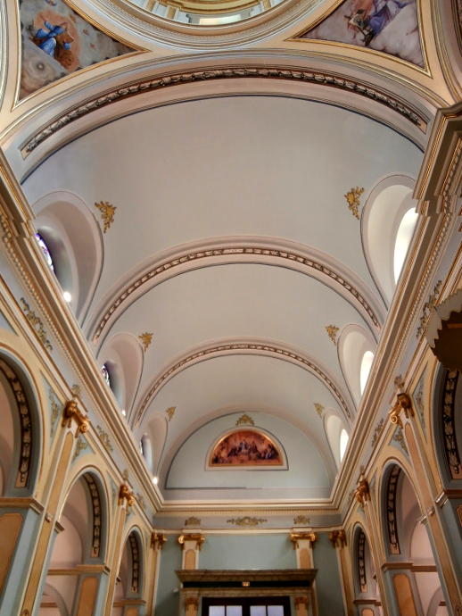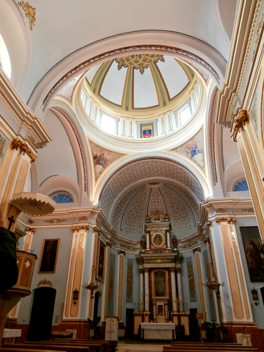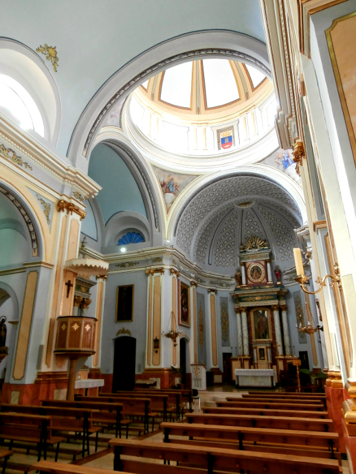 «…Templo construido entre 1820 y 1875, situado sobre un montículo, presidiendo el caserío. Sus dimensiones son superiores a lo que cabría esperar del modesto tamaño de la población. Tiene planta de cruz latina y nave de tres tramos cubierta con bóveda de cañón con lunetos ciegos y capillas laterales cubiertas con bóvedas vaídas. Se remata con un ábside tras el presbiterio. La decoración interior es escasa, pero hay frescos y relieves de escayola en cúpula, presbiterio y pechinas. Destacan los tres altares clásicos del crucero y presbiterio, las pilastras clásicas de la nave, el piso antiguo de baldosas cerámicas y la cúpula de tambor iluminado de grandes dimensiones. La fábrica es de mampostería vista al exterior con sillares en zócalo y esquinas. La cúpula se cubre con tejas blancas y azules, destacando la torre prismática situada a los pies, casi exenta, con el cuerpo de campanas construido en ladrillo y rematada con una cúpula…». (7)