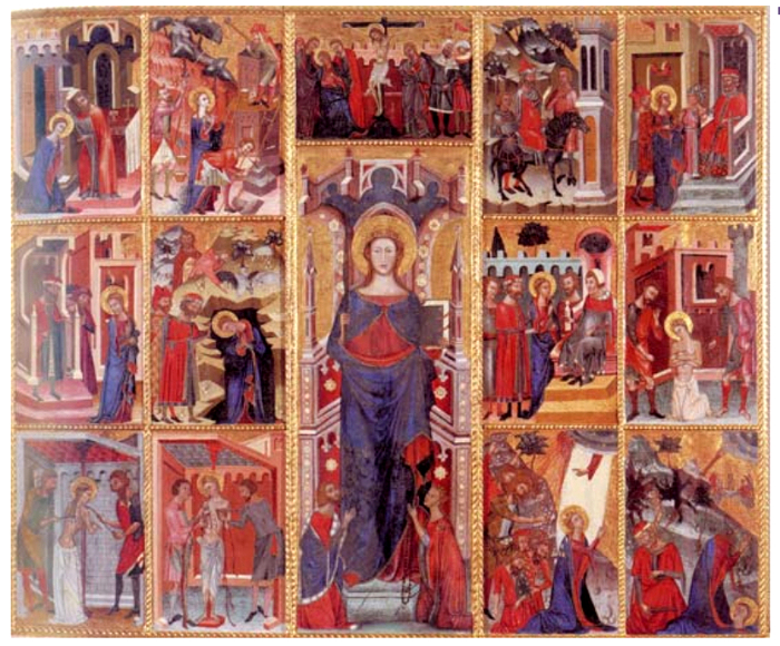 Retablo de Santa Bárbara de la ermita de Santa Bárbara de Cocentaina, atribuido al maestro d’Albal, realizado entre 1378 y 1387, actualmente en el Palau Comtal. (4)