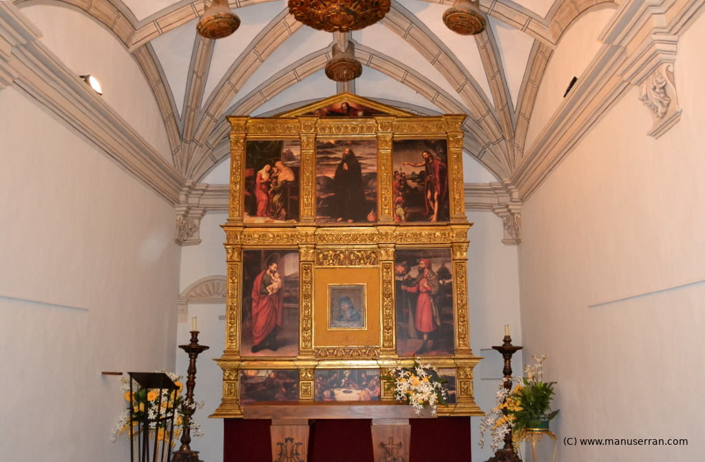 Tiene un retablo que es obra del pintor contestano Nicolás Borrás, que data de principios del siglo XVII y que consta de nueve tablas. En la calle lateral derecha, de arriba abajo aparecen representados Santa Ana, la Virgen y el Niño en una tabla y San José y el Niño. En la central, sobre una Virgen del Milagro, ajena al retablo, copia del original, hoy en la iglesia del convento, pero que Figueras Pacheco (2) dice que fue pintada por V. López. Y San Antonio Abad, patrono de la capilla. En el lateral derecho, arriba la predicación de San Juan Bautista y debajo San Joaquín. En la predela, de izquierda a derecha: Estigmación de San Francisco de Asís, “Sagrada Cena” y Santo Domingo Penitente. En el ático, el Padre Eterno.