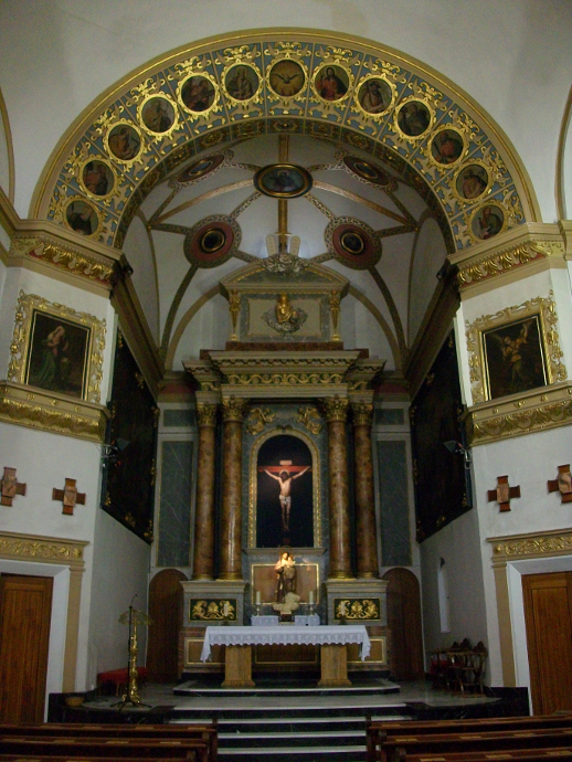 «…Se trata de una iglesia de gran interés arquitectónico. Destacan los arcos fajones apoyados sobre ménsulas, los arcos de embocadura de las capillas y otros detalles renacentistas sobre los que se superponen figuras y dorados barrocos. El presbiterio es profundo, se cubre con una bóveda vaída tabicada, aunque conserva pintado el juego de nervios y claves; tiene menor altura que la nave y se una a ésta mediante un arco abocinado con figuras de los apóstoles pintadas en el interior de los tondos. La iluminación es escasa, ya que no cuenta más que con el óculo de la fachada de los pies. El campanario, situado en la parte posterior, es de poca altura y de planta cuadrada, construido de sillería, sin ornamento alguno excepto en el cuerpo de campanas que tiene pilastras ligeramente resaltadas.