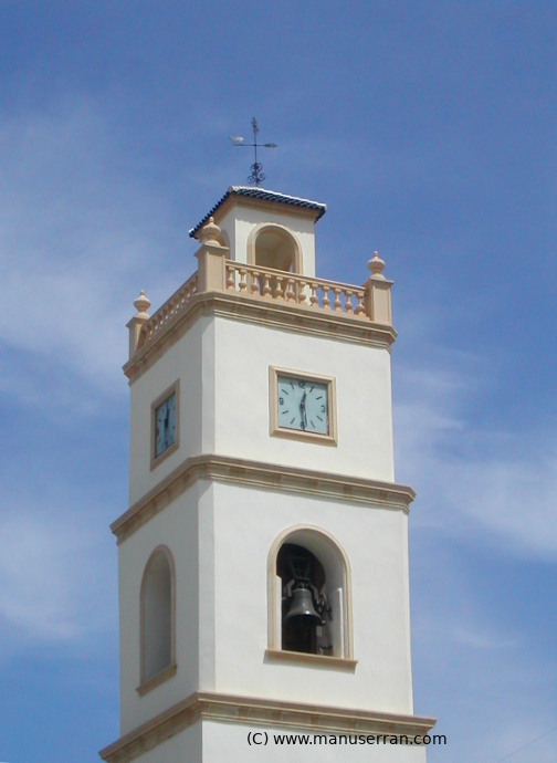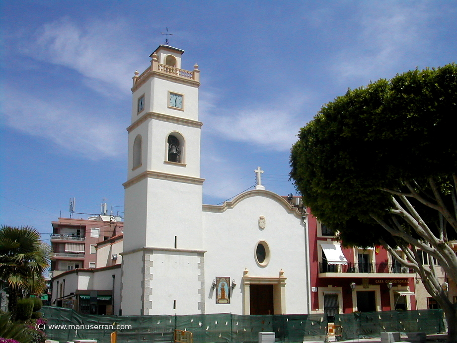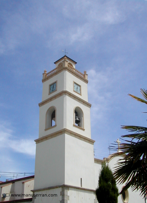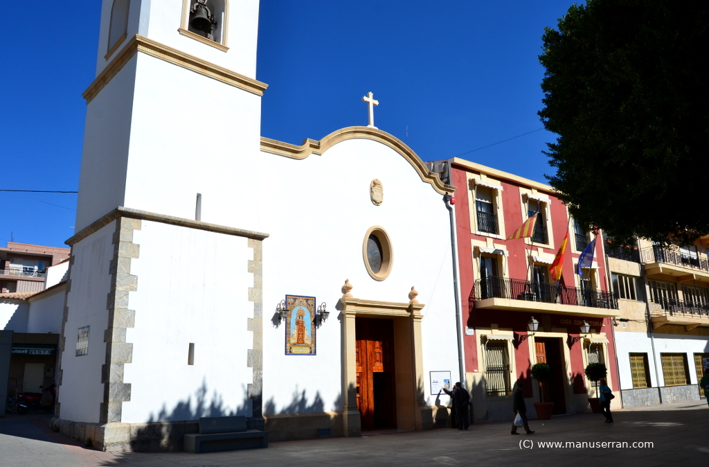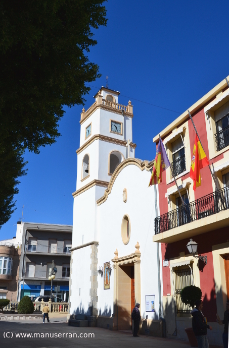 «…La iglesia adosada antiguamente al convento, hoy Ayuntamiento, tiene la fachada, orientada a mediodía, rectangular con perfil superior en arco rebajado y un escalón a cada lado. Puerta en dintel y, sobre ésta, óculo elipsoide que da luz al coro. A la izquierda tiene campanario de planta cuadrada con sillares en las esquinas, tramo de campanas y otro superior con el reloj, termina en terracilla abalaustrada y torrecilla.
