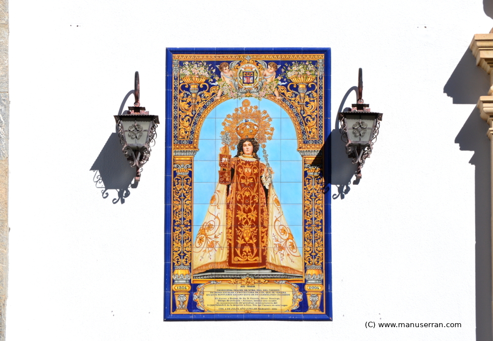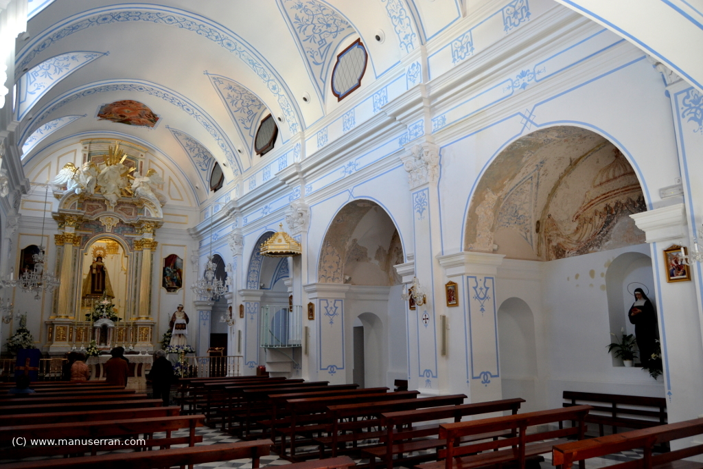 La planta es de cruz latina con capillas entre contrafuertes y crucero del ancho de la nave más las capillas.. A los pies tiene coro: la nave cubre con bóveda de cañón sobre pilares cruciformes con pilastras, capiteles corintios, entablamento y arcos fajones; tiene capillas poco profundas, con entrada en arco de medio punto sobre impostas. El crucero es ocupado todo él por el presbiterio; tiene testero recto en el que se apoya un retablo neoclásico formado por cuatro columnas y entablamento, parejo al de la nave, que enmarcan el hueco del camarín con la imagen de Nuestra Señora del Carmen. El camarín, adosado a la cabecera de la nave, es de planta octogonal y cubierta con pirámide. Una capilla, al lado izquierdo, alberga a la antigua patrona, la Virgen de las Virtudes. Revestimiento blanco con molduras y detalles en ocre y dorados, dibujos lineales y ramilletes geométricos…». (5)