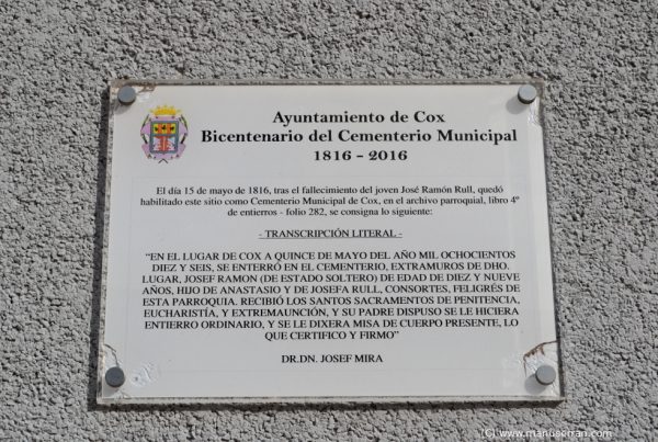 «…COX: Lugar con ayuntamiento de la provincia de Alicante, partido judicial de Dolores…, diócesis de Orihuela: Situado en la huerta de esta ciudad y faldas septentrionales de la sierra de Callosa donde le combaten los vientos del Este y algunas veces los del Sur, con clima templado y sano, pues no se conocen otras enfermedades que las estacionales. Tiene sobre 320 casas bastante decentes, las cuales alternan con varios jardines de palmeras, naranjos y otros árboles frutales, y se distribuyen en calles por lo común llanas y regularmente espaciosas; dos plazas una llamada Mayor y de San Juan, y dos plazuelas algo reducidas; casa capitular y cárceles de propiedad del señor territorial (hoy dia la señora duquesa de San Fernando), un palacio antiguo del mismo, otro moderno construido por el difunto obispo D. José Toreno, una escuela de niños á la que concurren 50, dotada con 1,500 reales, otra de niñas con 48 de asistencia y 800 reales de dotación, y una iglesia parroquial (San Juan Bautista), de primer ascenso, servida por un cura de provisión real ó del ordinario, según el mes de la vacante en riguroso concurso. Fué construida en el año 1776 por el famoso arquitecto Miguel Francia, á espensas del referido señor obispo Toreno, según se lee en una piedra colocada en la fachada de la misma iglesia, el cual la consagró en 1778 con solemnidad y pompa estraordinaria. Es un edificio sólido de mucho gusto, todo de mamposteria, dividido en tres naves, hermoseándole estraordinariamente la uniformidad de sus altares, y su claridad por la elevación de su media naranja, con ocho grandes ventanas y adornada de varios relieves. La torre descansa en su mayor parte sobre una de las bóvedas de la capilla, lo cual es verdaderamente admirable, y prueba la mucha solidez de la fábrica, que no sufrió el menor deterioro en los fuertes sacudimientos del espantoso terremoto del 21 de marzo de 1839. Hubo un convento de P P. carmelitas calzados, en cuya iglesia se daba culto á la imagen de Nuestra Señora de las Virtudes de grande veneración en el pueblo, la cual se trasladó á la parroquia desde la supresión de aquel: el señor territorial es el patrono de dicha imagen como igualmente lo era de la iglesia del convento á cuyas espensas se hizo. El cementerio es bastante capaz, y se halla fuera del pueblo en un sitio ventilado… Antiguamente esta población estaba dividida en dos: Cox Viejo y Nuevo, existiendo todavía la casa consistorial del antiguo Cox, según los títulos que presenta el marqués de Albatera; fué comprado en 1600 por mosen Ruiz Dávalos por la cantidad de 50,000 sueldos á una tia María, vecina de Orihuela, quien lo obtuvo de Raes-Abdenaden. Consta por una bula de su Santidad que la feligresia del lugar de la Granja, fué separada de esta parroquia por motivo de no serle fácil, según dice la bula, al rector de esta parroquia, pasar á dicho lugar muchos dias festivos…». (1)