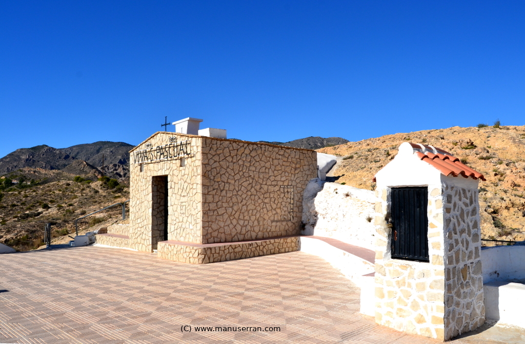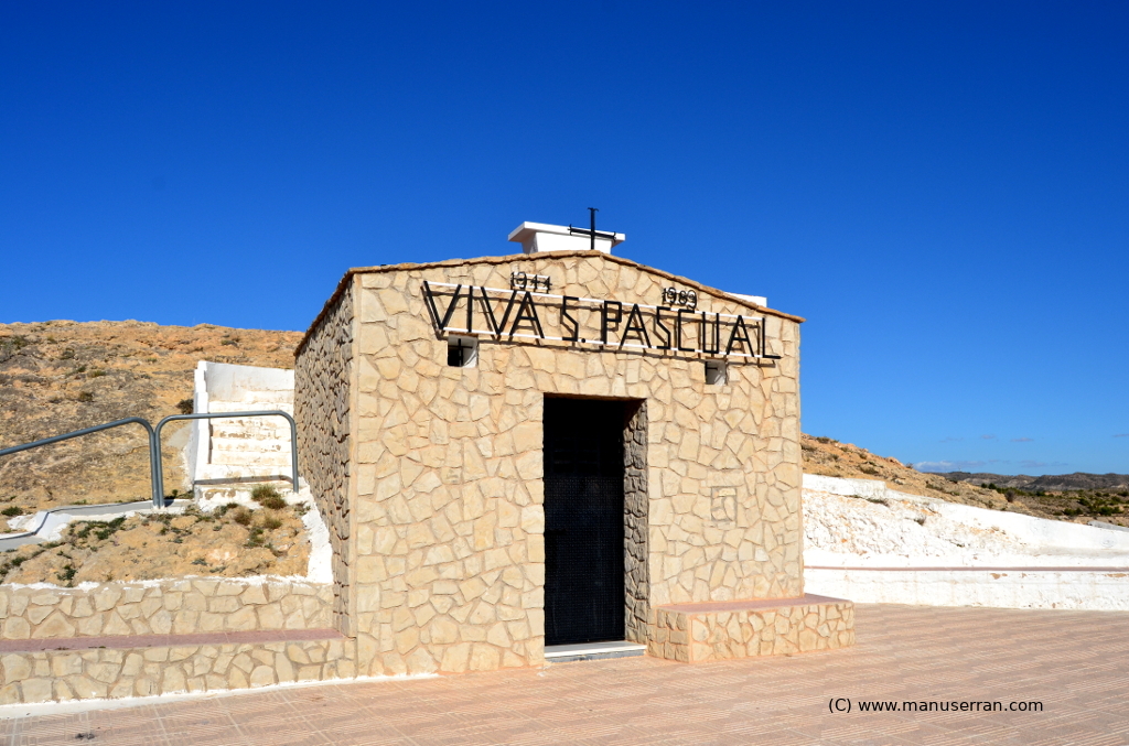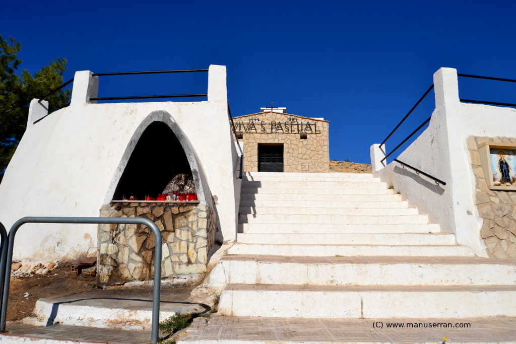 Se trata de una ermita cueva, tal vez a imitación de la de Orito de Monforte. Debido a un incendio acaecido por causa de los velones votivos se ha restaurado completamente ermita y alrededores. Cuando se sube por el pedregoso camino llegamos al acceso que consiste en una decena de escalones. Al lado derecho un retablo cerámico con la figura del Santo y a la izquierda se ha instalado un crematorio para los citados velones votivos. Ya en la plazuela, realizada delante de la ermita, ésta se nos muestra como un pequeño prisma de faz pentagonal realizado con mampostería sin cubrir. A la izquierda una escalinata sube al techo donde se ha instalado un altar para las celebraciones eucarísticas, de cara a los numerosos devotos que se congregan. En el interior, este recinto es la antesala de la cueva; encontramos colgados numerosos ex-votos de todas las clases, no se permiten poner lámparas debido al citado incendio. Frente a la entrada se excava la cueva cerrada al frente por una hornacina acristalada con la imagen de San Pascual…». (1)