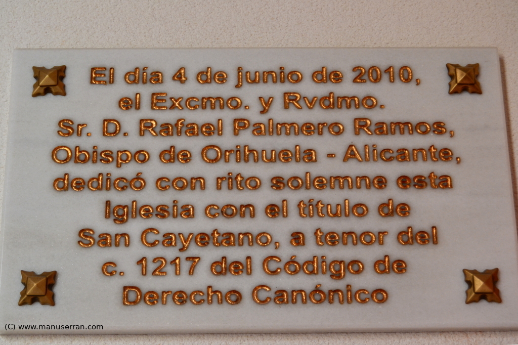 A la entrada, una placa de mármol blanco dice lo siguiente: ”El día 4 de junio de 2010, el Excmo. y Rvdmo. Sr. D. Rafael Palmero Ramos, Obispo de Orihuela – Alicante, dedicó con rito solemne esta iglesia con el título de San Cayetano, a tenor del c. 1217 del Código de Derecho Canónico”.