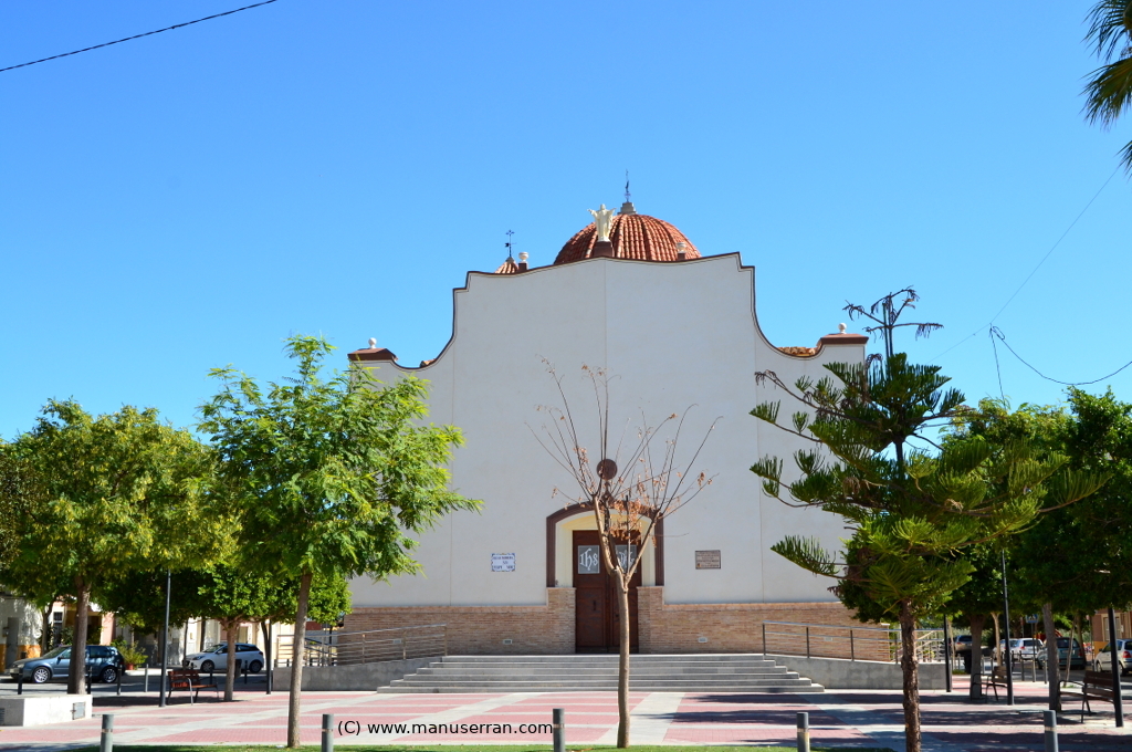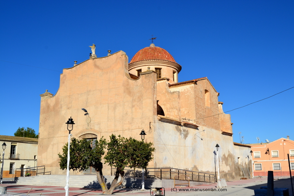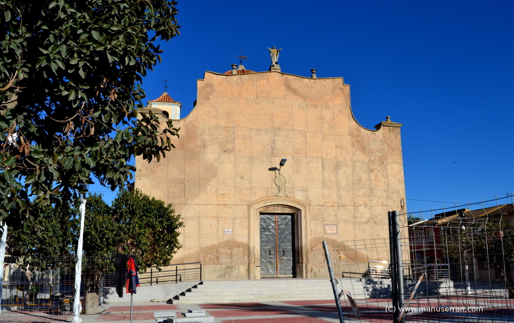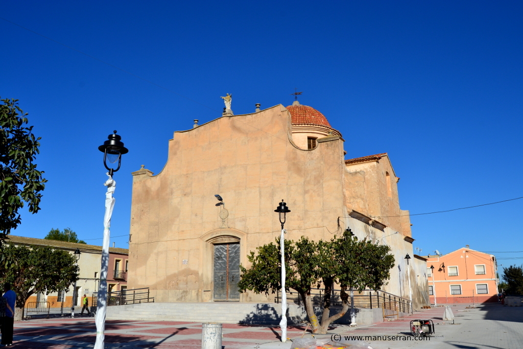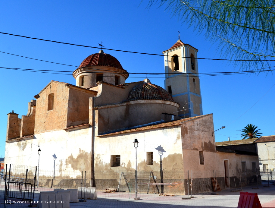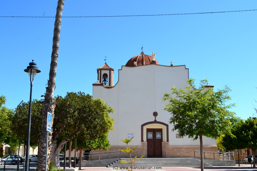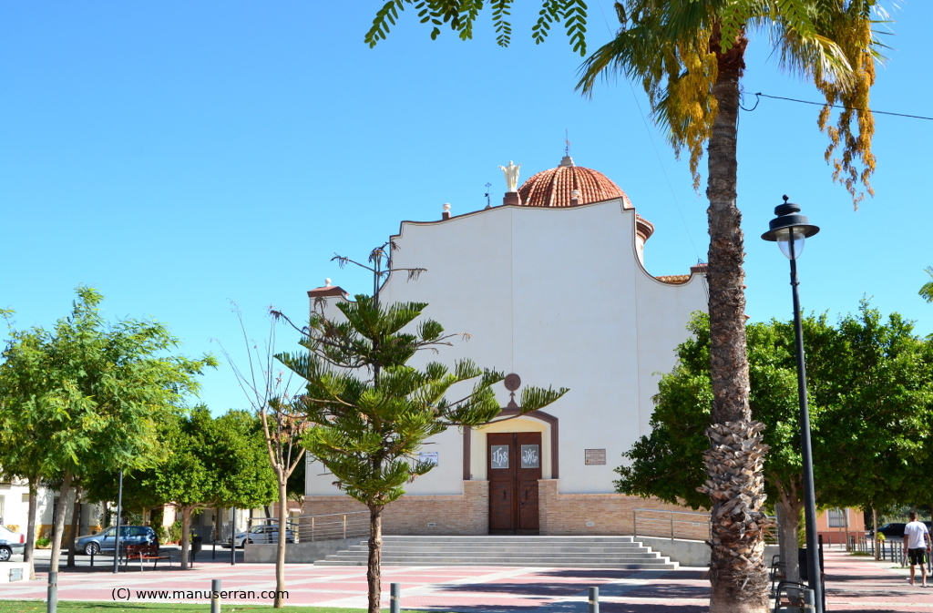 «…San Felipe Neri es una de las Pías Fundaciones del Cardenal Belluga fundada en el año 1732. El poblado consta de una gran plaza rectangular que la carretera atraviesa por el eje del lado mayor, en ella se sitúa la iglesia, construida entre 1735 y 1753. El interior es pobre (solo destaca la torre, situada en la cabecera, pintada de azul y blanco), pero el interior es interesante gracias a sus proporciones, la luminosidad y la procedencia culta de la contenida decoración de pilastras, capiteles, metopas y cornisas (cabecitas humanas, figuras de niño y dibujos geométricos en grisalla). La planta es de cruz latina, con una nave corta, de dos tramos, con capillas laterales comunicadas entre si por arcos de igual tamaño que los que dan a la nave. El presbiterio, semicircular, aloja una hornacina reciente con la imagen del santo que sustituyó al antiguo altar. La cúpula sobre pechinas tiene tambor y está resuelta de forma elegante…». (2)