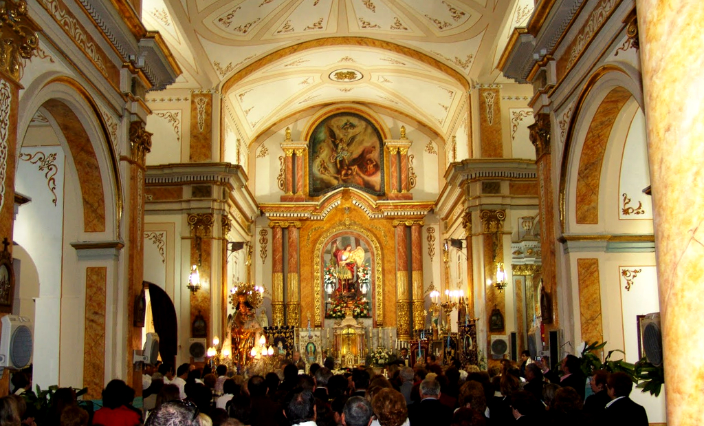 Se llegaba al presbiterio por unas gradas, estando presidido el altar mayor por un lienzo representando al titular del templo. A su vez, existía otro San Miguel de mazonería para las procesiones. La imagen más valiosa era sin duda la de Ntra. Sra. de la Leche, que fue hallada de piedra mármol. Ignoramos en que punto de la iglesia estaba instalada, como tampoco cierto altar dedicado a la Virgen del Rosario. Por el contrario se localizaban en el altar mayor la cruz procesional, un estandarte de tafetán blanco y varias alhajas. El equipamiento del edificio se completaba con dos lámparas de bronce, varios bancos de madera y un canzel a modo de confesionario con su rexilla.