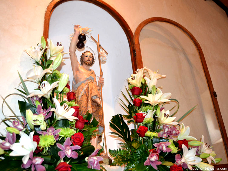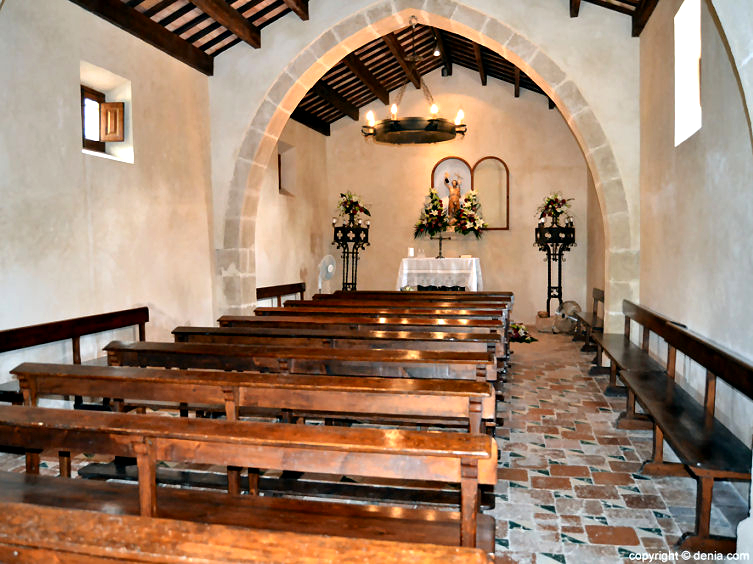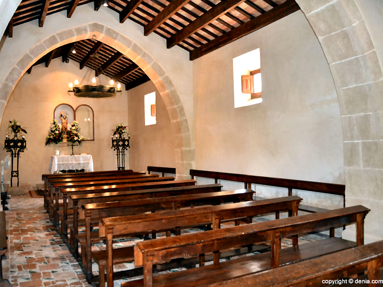 La ermita cuenta, además, con un singular ajuar de bienes muebles: dos cálices que se encuentran custodiados en la Parroquia de la Asunción de Denia. Uno más antiguo, de bronce plateado y copa de plata dorada de 1894. El otro, de estilo moderno, obra de Egino Weinert, del tercer cuarto del siglo recién pasado; además, la patena, el pie de altar, la cruz y las estaciones de Vía Crucis, etc…». (1)