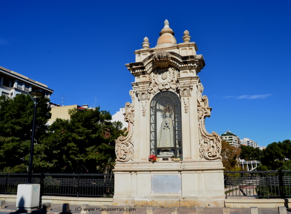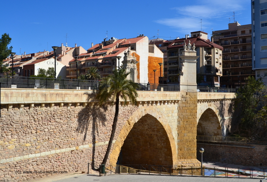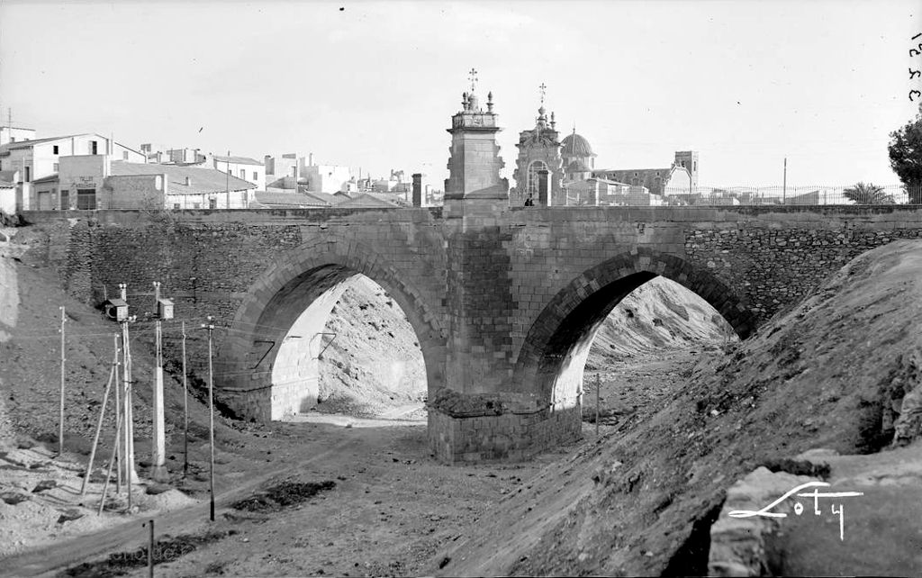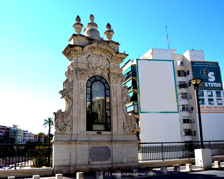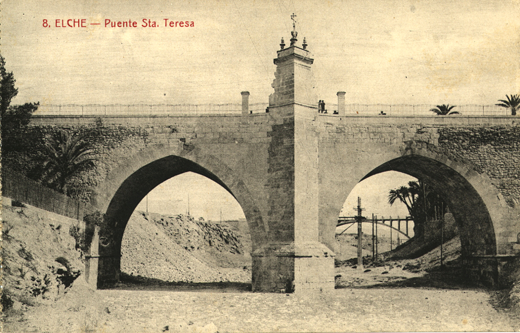 Ibarra y Ruiz nos refiere lo siguiente sobre el Puente de Santa Teresa, conocido también como Puente de la Virgen y Pont Vell (Puente Viejo): «…Se colocó su primer piedra, por el Duque de Arcos, D. Joaquín, el 2 de Mayo del año 1705, y por contratiempo de la guerra que entonces estalló, se hubieron de paralizar las obras, reanudándose en 1715. Solo tenía un ojo, y á consecuencia de la gran avenida de 1751, que tantos daños causó, se pensó abrirle otro. Iniciada suscripción y con lo que de propios añadió el Ayuntamiento, se construyó el ojo de la parte de Poniente en 1755. Se hizo el tajamar; se colocó una gran cadena á la parte de Levante y se levantaron dos capillas. La obra se concluyó en 1756. La baranda de madera colocóse para evitar los muchos suicidios que ocurrían, en 1855. En 1889 se reemplazo por la que hoy existe de hierro, sobre nuevo pretil de piedra, mejora que ha hermoseado mucho el puente…». (1)