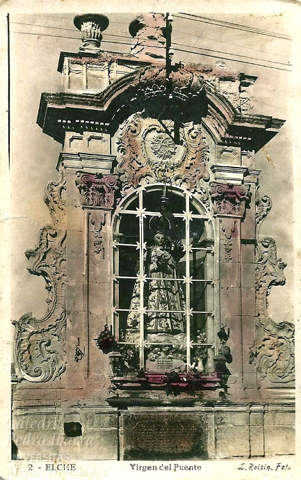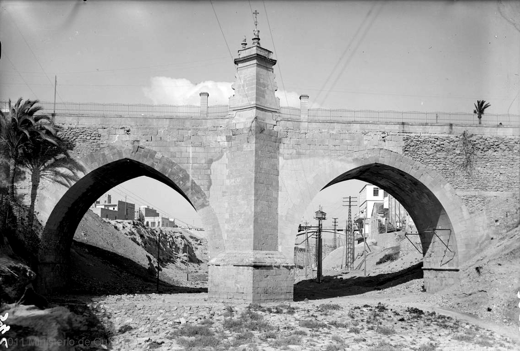 «…Este fue el primer puente de Elche sobre el Vinalopó que, anteriormente, se vadeaba mediante pasos de madera situados en el fondo del río. Los referentes formales lo acercan a las obras medievales, pero su concepción preludia la Ilustración. Es un puente de dos ojos con arcos ojivales poco apuntados y un tajamar central con un ángulo en planta de 90º. El tajamar llega hasta el nivel superior con un prisma triangular, donde se sitúan dos casalicios cerrados, también de planta triangular, con una decoración barroca, que albergan las imágenes de la Virgen de la Asunción y San Agatángelo realizadas en 1956 por José Gutiérrez Carbonell. La plataforma está señalada con una serie de pequeñas ménsulas sobre las que vuela un cuerpo de piedra a modo de cornisa de remate…». (2)