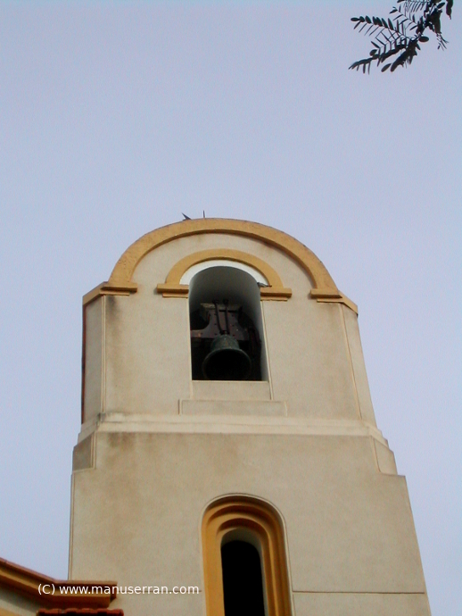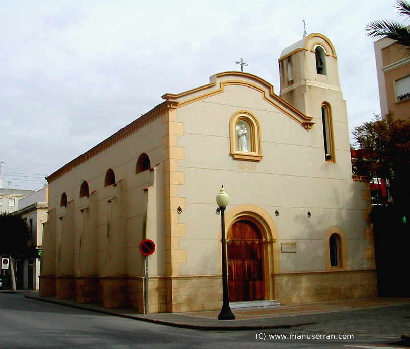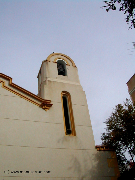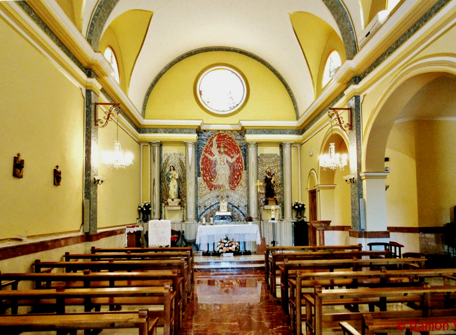 A la derecha, en la zona que corresponde a la nave accesoria, se eleva el campanario; tiene en su eje vertical una ventana baja y otra a media altura alargadas, la zona de campanas retranqueada en los laterales y el hueco de campanas, que repite el esquema compositivo de la fachada, confieren al campanario cierto grado de esbeltez y elegancia. Revestimiento blanco con perfiles y molduras en rojo inglés. La nave principal es rectangular, mide 9,70 por 4,90 metros; dos pares de pilastras, cornisa y arcos fajones, sustentan la bóveda de cañón que arranca de la cornisa y forma lunetos con los muros.