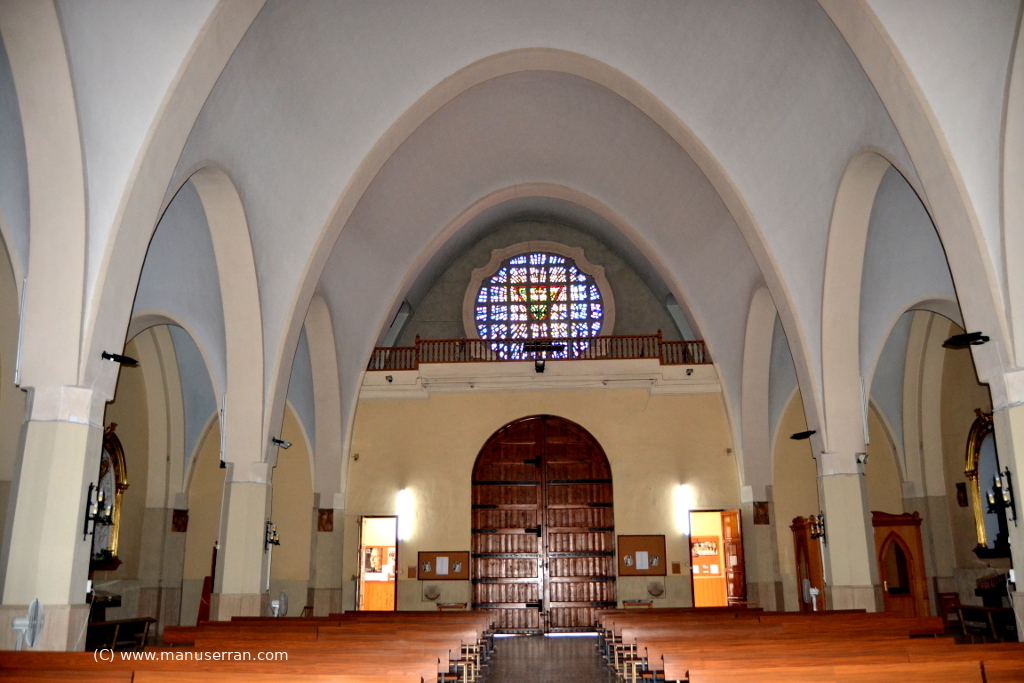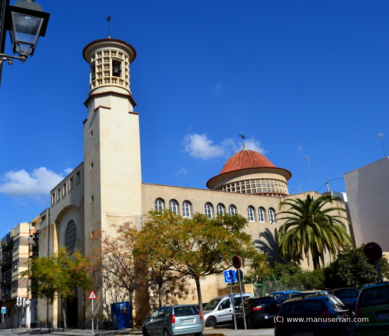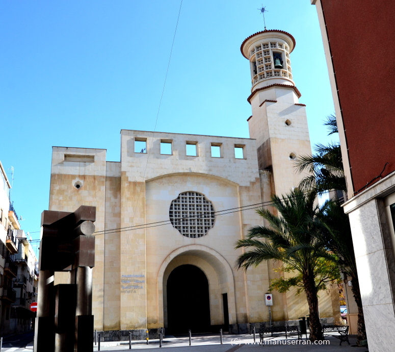 «…Del primitivo templo, destruido e incendiado en 1936, apenas quedan vestigios. La actual iglesia, situada en la Plaza de San Juan, fue construida entre los años 1953 y 1960. Esta nueva iglesia tiene planta de cruz latina, con seis capillas laterales definidas por pilares y arcos elípticos. En el crucero hay una cúpula sobre tambor de generatriz ovoidea, con ventanas en celosía que ocupan todo el perímetro. El campanario tiene sección cuadrada abajo y circular arriba. Tanto por fuera como por dentro destacan el esquematismo formal y ornamental y la composición en base a un monumentalismo plástico que quería ser moderno…». (3)