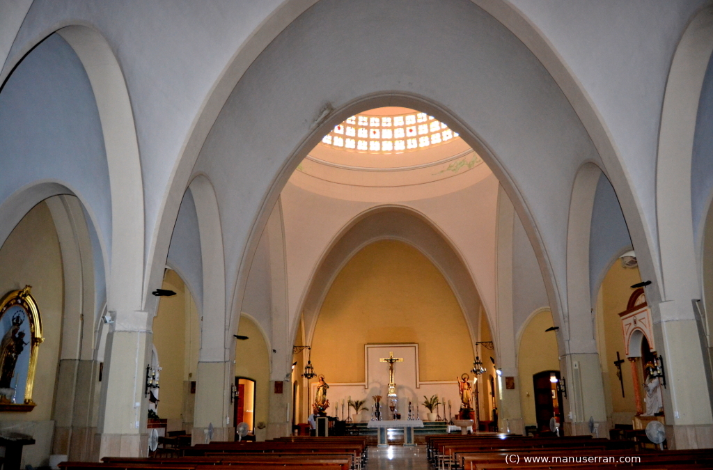 La planta del templo es de cruz latina, corto el crucero: la cúpula agrietada: grandes las ocho capillas: pobre su decoración general. En el lado derecho está abierta una puerta de entrada al templo. En el izquierdo otra que da ingreso á la sacristía, pieza reducida, adornada con un frontón de tela pintada al temple por el infortunado Manuel Pérez y algunos retratos. Una puertecita nos abre paso al jardín, y en un pasillo nos conduce á una mala escalera por donde se sube al archivo y demás habitaciones. Encima de la entrada á la sacristía, está el órgano.