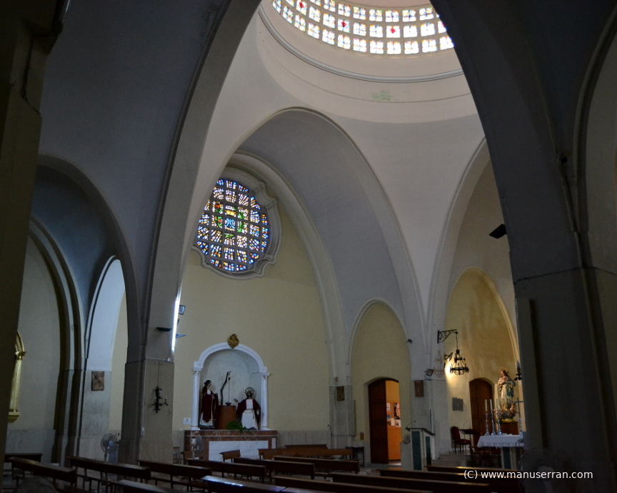 La cúpula está levantada sobre un cimborio octogonal, que tiene una ventana en cada una de sus caras ó planos. La puerta principal de la iglesia se abre al pié de la nave y frente al altar mayor. Á su lado derecho tiene una hermosa pintura sobre tabla representando el Nacimiento de San Juan Bautista, y al izquierdo otra que representa á San Juan en la prisión. Según su estilo y caracteres, parecen ser estas pinturas del siglo XVI y formaban parte, con otras que se conservan en el coro de la descrita iglesia, del antiguo Retablo del altar mayor de la misma. El orden arquitectónico general de este templo, es el compuesto.
