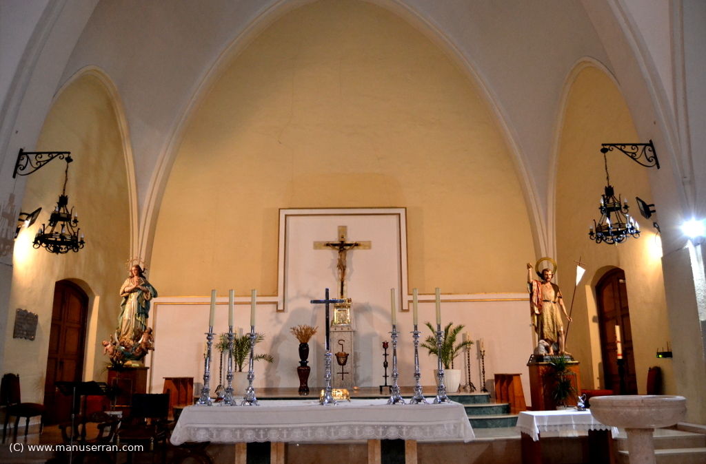 Este templo es grande, y la riqueza artística y mérito de sus altares, es superior á todos los de Elche. Su altar mayor es un severo pórtico que tiene un hermoso cornisamento sostenido por cuatro columnas. En lo alto destaca un escudo herádico con las armas del duque de Maqueda, señor que fué de Elche. El lienzo representa á San Juan bautizando á Jesús, y es pintura regular. Este altar está privilegiado por el pontífice Pío VI. Costó cerca de 1.000 pesos (3.750 pesetas).