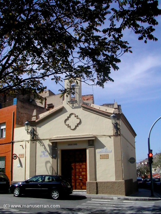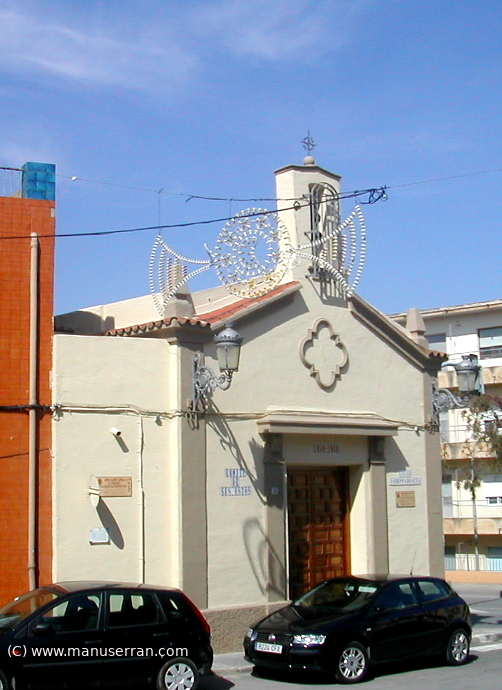 Se trata de un edificio adosado al costado izquierdo y parte trasera, los dos lados libres forman esquina. Está fabricado con muros de mampostería y tejado a dos aguas de teja plana. La fachada, estucada en ocre, con zócalo y fajones marrones. Dos pilastras en las esquinas sostienen una cornisa de teja pequeña curva y, sobre ésta, se prolongan en pináculos piramidales. Otros fajones, a los lados de la puerta, sostienen un tejadillo sobre la misma. Tiene escritas la fecha de su construcción en 1950 y reconstrucción en 1988. Rótulo con el nombre de la ermita en azulejos. En el frontón, un adorno lobulado alberga un farolillo de hierro. La espadaña (7) está formada por dos pilares con tejadillo y se remata por una bola y cruz de hierro con adornos; reciente protección de la campana con verja.