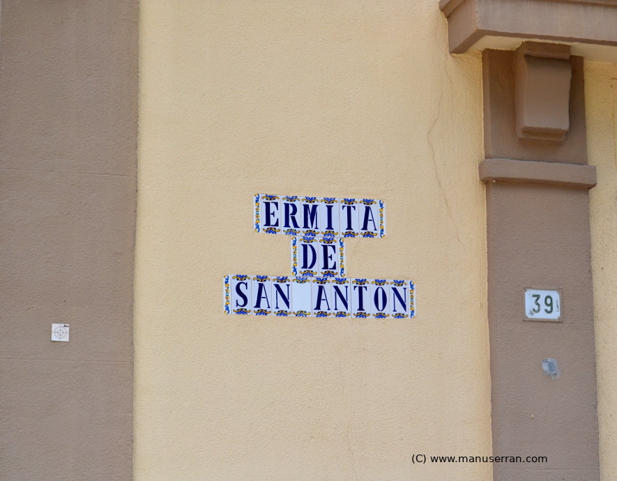 «…La ermita de San Antón, como actualmente se la denomina, se construyó sobre la mezquita vieja de Elda a finales del siglo XV. Originariamente se la llamó de Santa Catalina Mártir, nombre que coexistió con el de San Antón durante algún tiempo. Se situaba al lado de una de las puertas de entrada a la villa, el portal de San Antón, junto a la placeta del mismo nombre, pero en una ubicación distinta a la que tiene hoy en día. Fue derribada en la segunda década del siglo XX y reconstruida posteriormente en un solar cercano al que ocupó antaño.